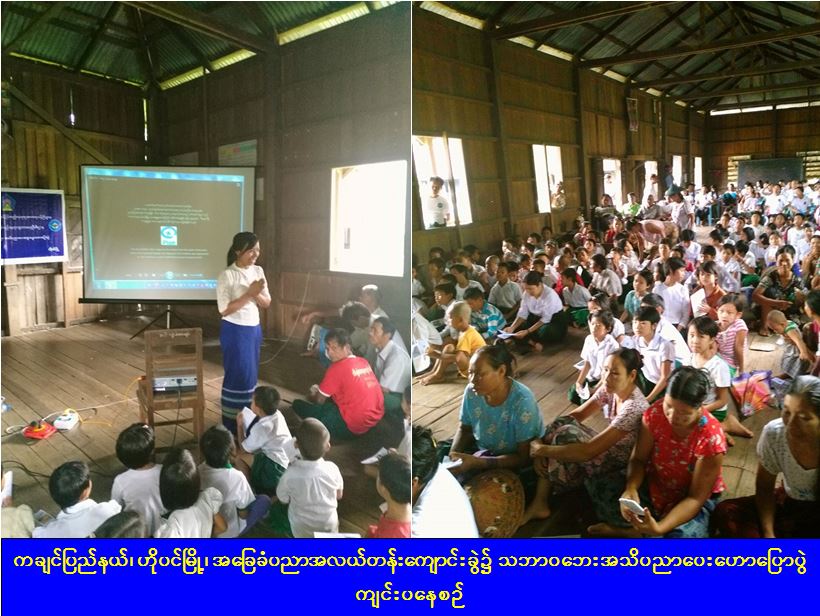 ကယ်ဆယ်ရေးနှင့်ပြန်လည်နေရာချထားရေးဦးစီးဌာန၊ ကချင်ပြည်နယ်ဦးစီးမှူးရုံးမှ တာဝန်ရှိသူများသည် (၂၉.၉.၂၀၁၆) ရက်နေ့တွင် ကချင်ပြည်နယ်၊ ဟိုပင်မြို့၊ အခြေခံပညာအလယ်တန်းကျောင်းခွဲ၌ သဘာဝဘေးအသိပညာပေးဟောပြောပွဲပြုလုပ်ခဲ့ရာ ကျောင်းသား/ကျောင်းသူနှင့် ရပ်မိရပ်ဖ စုစုပေါင်းလူအင်အား (၄၀၀)ကျော် တက်ရောက်ခဲ့ကြောင်း သတင်းရရှိပါသည်။