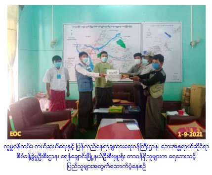 လူမှုဝန်ထမ်း၊ ကယ်ဆယ်ရေးနှင့် ပြန်လည်နေရာချထားရေးဝန်ကြီးဌာန၊ ဘေးအန္တရာယ်ဆိုင်ရာစီမံခန့်ခွဲမှုဦးစီးဌာန၊ ရေနံချောင်းမြို့နယ်ဦးစီးမှူးရုံးမှ တာဝန်ရှိသူများသည် ရေနံချောင်းမြို့နယ်၊ မာန်မြေကျေးရွအုပ်စု၊ မိန်းမလှကျွန်းကျေးရွာတွင် (၁.၉.၂၀၂၁)ရက်နေ့တွင် ဧရာဝတီမြစ်ရေဝင်ရောက်မှုကြောင့် ပင်းစက္ကလံပ ကယ်ဆယ်ရေးစခန်းသို့ ပြောင်းရွေ့ရသော အိမ်ခြေ (၆)လုံးရှိ ရေဘေးသင့်လူဦးရေ (၂၄) ဦးအတွက်ဆန်ရိက္ခာ (၇)ရက်စာ(၅၀၄၀ဝိ/-)အား အထွေထွေအုပ်ချုပ်ရေးးဦးစီးဌာန၊ မြို့နယ်အုပ်ချုပ်ရေးမှူးရုံးခန်းတွင် မြို့နယ်အုပ်ချုပ်ရေးမှူးနှင့် အတူ ဘေးသင့်ပြည်သူသူများထံ (၂.၉.၂၀၂၁)ရက်နေ့၊ (၁၂း၄၀) အချိန်တွင်ထောက်ပံ့ပေးအပ်ခဲ့ပါကြောင်း သတင်းရရှိပါသည်။