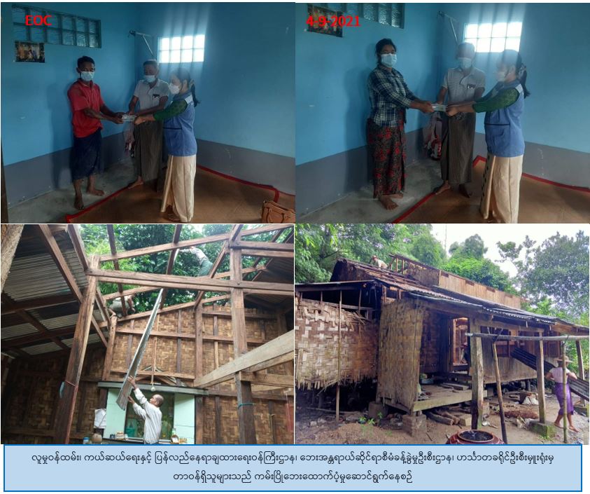 လူမှု၀န်ထမ်း၊ ကယ်ဆယ်ရေးနှင့် ပြန်လည်နေရာချထားရေး၀န်ကြီးဌာန၊ ဘေးအန္တရာယ်ဆိုင်ရာစီမံခန့်ခွဲမှု ဦးစီးဌာန၊ ဟင်္သာတခရိုင်ဦးစီးမှူးရုံးမှ တာဝန်ရှိသူများသည် ဟင်္သာမြို့နယ်၊ အိပ်ပျက်ကျေးရွာအုပ်စု၊ ဖောင်ဆိပ်ကျေးရွာ၌ ဖြစ်ပွားခဲ့သော ကမ်းပြိုဘေးကြောင့် (၂.၉.၂၀၂၁)ရက်နေ့တွင် ရွှေ့ပြောင်းအိမ်ခြေ(၆)လုံးအတွက် အိမ်ဆောက်ပစ္စည်းရန်ပုံငွေ(၆၀၀၀၀၀)၊လူဦးရေ (၂၅)ဦးအတွက် ဆန်ရိက္ခာဖိုးရန်ပုံငွေ (၅၂၅၀၀)၊စုစုပေါင်းရန်ပုံငွေ(၆၅၂၅၀၀)နှင့် လူဦးရေ (၂၅)ဦးအတွက် Surgical Masks (၅၀)ခုတို့အား (၄.၉.၂၀၂၁)ရက်နေ့(၁၂:၃၀)နာရီတွင် ဟင်္သာတမြို့နယ်စီမံအုပ်ချုပ်ရေးအဖွဲ့ရုံးမှ တာဝန်ရှိသူများနှင့် အတူ ဘေးသင့်ပြည်သူများထံသို့ထောက်ပံ့ပေးအပ်ခဲ့ပါကြောင်း သတင်းရရှိပါသည်။