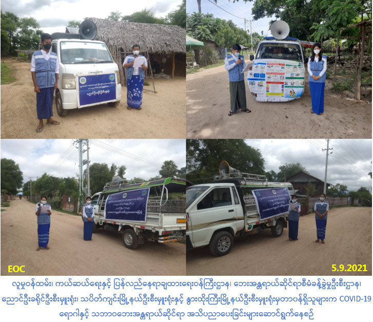 လူမှု၀န်ထမ်း၊ ကယ်ဆယ်ရေးနှင့်ပြန်လည်နေရာချထားရေး၀န်ကြီးဌာန၊ ဘေးအန္တရာယ်ဆိုင်ရာစီမံခန့်ခွဲမှုဦးစီးဌာန၊ မန္တလေးတိုင်းဒေသကြီးအတွင်းရှိ ညောင်ဦးခရိုင်ဦးစီးမှူးရုံး၊ သပိတ်ကျင်းမြို့နယ်ဦးစီးမှူးရုံးနှင့် နွားထိုးကြီးမြို့နယ်ဦးစီးမှူးရုံးတို့မှတာ၀န်ရှိသူများသည် (၅-၉-၂၀၂၁)ရက်နေ့တွင် ညောင်းဦးမြို့နယ်၊ သပိတ်ကျင်းမြို့နယ်၊ နွားထိုးကြီးမြို့နယ်ရှိ ရပ်ကွက်/ ကျေးရွာအုပ်စုနှင့် ကျေးရွာများ၌ COVID-19 ကူးစက်ရောဂါနှင့် ရာသီအလိုက်ဖြစ်ပွားတတ်သော သဘာဝဘေးအန္တရာယ်များနှင့်စပ်လျဉ်း၍ အသိပညာပေးခြင်းများကို ဆောင်ရွက်ခဲ့ပါကြောင်း သတင်းရရှိပါသည်။