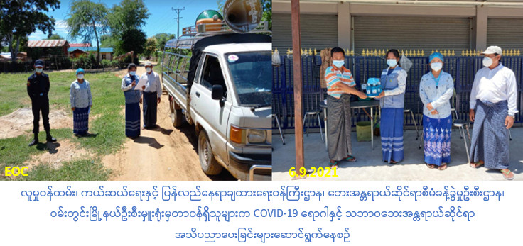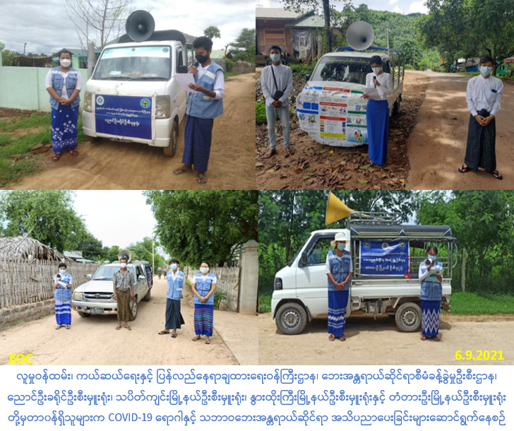 လူမှု၀န်ထမ်း၊ ကယ်ဆယ်ရေးနှင့်ပြန်လည်နေရာချထားရေး၀န်ကြီးဌာန၊ ဘေးအန္တရာယ်ဆိုင်ရာစီမံခန့်ခွဲမှုဦးစီးဌာန၊ မန္တလေးတိုင်းဒေသကြီးအတွင်းရှိ ညောင်ဦးခရိုင်ဦးစီးမှူးရုံး၊ သပိတ်ကျင်း မြို့နယ်ဦးစီးမှူးရုံး၊ နွားထိုးကြီးမြို့နယ်ဦးစီးမှူးရုံး၊ တံတားဦးမြို့နယ်ဦးစီးမှူးရုံးနှင့် ဝမ်းတွင်း မြို့နယ်ဦးစီးမှူးရုံးတို့မှ တာ၀န်ရှိသူများသည် (၆-၉-၂၀၂၁) ရက်နေ့တွင် ကျောက်ပန်းတောင်း မြို့နယ်၊ သပိတ်ကျင်းမြို့နယ်၊ နွားထိုးကြီးမြို့နယ်၊ တံတားဦးမြို့နယ်နှင့် ဝမ်းတွင်းမြို့နယ်များရှိ ရပ်ကွက်/ ကျေးရွာအုပ်စုနှင့် ကျေးရွာများ၌ COVID-19 ရောဂါနှင့် ရာသီအလိုက်ဖြစ်ပွားတတ်သော သဘာဝဘေးအန္တရာယ်များနှင့်စပ်လျဉ်း အသိပညာပေးခြင်းများကို ဆောင်ရွက်ခဲ့ပါကြောင်း သတင်းရရှိပါသည်။