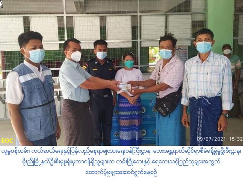 လူမှု၀န်ထမ်း၊ ကယ်ဆယ်ရေးနှင့်ပြန်လည်နေရာချထားရေး၀န်ကြီးဌာန၊ ဘေးအန္တရာယ်ဆိုင်ရာစီမံခန့်ခွဲမှုဦးစီးဌာန၊ မိုးညိုမြို့နယ်ဦးစီးမှူးရုံးမှတာဝန်ရှိသူများသည် ပဲခူးတိုင်းဒေသကြီး၊ သာယာဝတီခရိုင်၊ မိုးညိုမြို့နယ်၊ ကျေးရွာအုပ်စု(၅)အုပ်စု၊ ကျေးရွာ(၅)ရွာတို့တွင် (၂-၉-၂၀၂၁)၊ (၄-၉-၂၀၂၁)ရက်နေ့နှင့်(၅-၉-၂၀၂၁)ရက်နေ့တို့၌ ဖြစ်ပွားခဲ့သော ကမ်းပြိုဘေးနှင့်ရေဘေးတို့မှ ကမ်းပြိုဘေးသင့် ကြိုတင်ပြောင်းရွှေ့နေအိမ်(၁၄)လုံးနှင့် ရေဘေးသင့်ပြိုလဲနေအိမ်(၄)လုံး တို့အတွက် စုစုပေါင်းအိမ်ဆောက်ပစ္စည်းဖိုး ထောက်ပံ့ငွေ(၁,၈၀၀,၀၀၀/-)ကျပ်နှင့် အိမ်ထောင်စု (၁၈)စုရှိ လူဦးရေ(၆၇)ဦးတို့အတွက် ဆန်ရိက္ခာ(၇)ရက်စာဖိုးထောက်ပံ့ငွေ(၁၄၀,၇၀၀/-)ကျပ်၊ စုစုပေါင်းထောက်ပံ့ငွေ(၁,၉၄၀,၇၀၀/-)ကျပ်နှင့် ရေဘေးသင့်ပြိုလဲနေအိမ်(၄)အိမ်ထောင်စုအတွက် ကယ်ဆယ်ရေးပစ္စည်း(၁၇)မျိုးပါ ပုံး(၄)ပုံးတို့အား (၇-၉-၂၀၂၁)ရက်နေ့၊ (၁၅း၀၀)နာရီ အချိန်တွင် မြို့နယ်အထွေထွေအုပ်ချုပ်ရေးဦးစီးဌာန၊ စုပေါင်းရုံးရှိ(OSS)ရုံးခန်း၌ မြို့နယ်စီမံအုပ်ချုပ်ရေးအဖွဲ့မှတာဝန်ရှိသူများ၊ မြို့နယ်မီးသတ်တပ်ဖွဲ့၊ မြို့နယ်ပြန်/ဆက်မှတာဝန်ရှိသူများ၊ ကျေးရွာအုပ်ချုပ်ရေးမှူးများ၊ ရပ်ကျေးစာရေးများနှင့်အတူ ဘေးသင့်ပြည်သူများ၏ လက်ဝယ်အရောက် ထောက်ပံ့ပေးအပ်ခဲ့ပါကြောင်း သတင်းရရှိပါသည်။