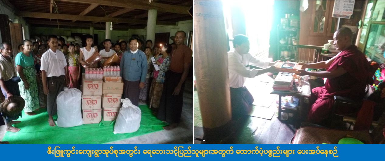 ဇီးဖြူကွင်းကျေးရွာအုပ်စုအတွင်း ရေဘေးသင့်ပြည်သူများအတွက် ခေါက်ဆွဲခြောက် (၄၀) ဖာ x (၁၈၀) ထုပ် = (၇၂၀၀) ထုပ်၊ အာဟာရမှုန့် (၄) ဖာ x (၄၀) ထုပ် = (၁၆၀) ထုပ်၊ Relief Bags(SCG) (၁၀) အိတ် x (၁၀) ထုပ် = (၁၀၀) ထုပ်၊ ရေသန့်(SCG) (၁၂) ကဒ် x (၁၀) ဗူး=(၁၂၀) ဗူး၊ ငါးသေတ္တာ (၁၅) ဗူး၊ သင်္ကန်း(၃) စုံ၊