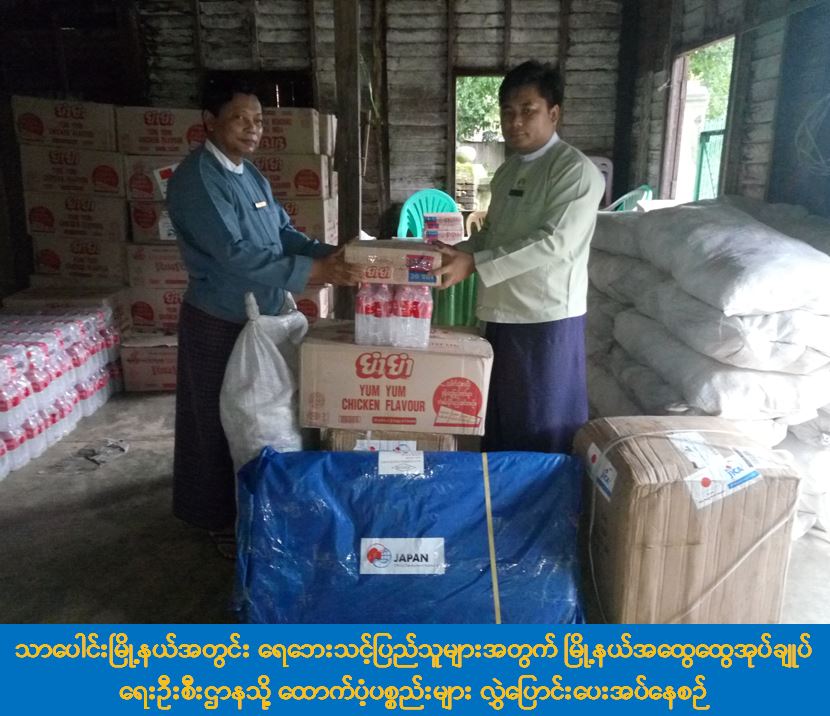 သာပေါင်းမြို့နယ်အတွင်း ရေဘေးသင့်ပြည်သူများအတွက် ခေါက်ဆွဲခြောက် (၉၄) ဖာ x (၁၈၀) ထုပ် + (၉၀) ထုပ် = (၁၇၀၁၀) ထုပ်၊ အာဟာရမှုန့် (၉) ဖာ x (၄၀) ထုပ် = (၃၆၀) ထုပ်၊ Relief Bags (SCG) (၁၀၀) အိတ် x (၁၀) ထုပ် = (၁၀၀၀) ထုပ်၊ ရေသန့် (SCG) (၇၇) ကဒ် x (၁၀) ဗူး = (၇၇၀) ဗူး၊ Red Cap (ဂျပန်အလှူ) = (၉၅၀) ဗူး၊ တာပေါ်လင် (ဂျပန်အလှူ) = (၁၀၀) ထုပ်၊ Foldable Tank (ဂျပန်အလှူ) = (၃၂) ဗူး၊ Polyester Tank (ဂျပန်အလှူ) = (၂၄) ဗူး၊