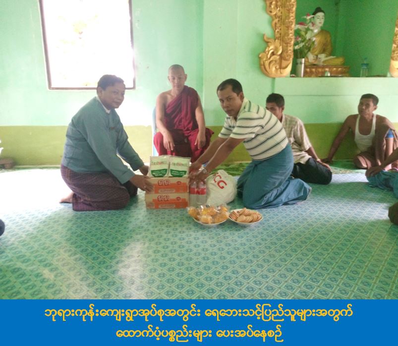 ဘုရားကုန်းကျေးရွာအုပ်စုအတွင်း ရေဘေးသင့်ပြည်သူများအတွက် ခေါက်ဆွဲခြောက် (၄၀) ဖာ x (၁၈၀) ထုပ် = (၇၂၀၀) ထုပ်၊ အာဟာရမှုန့် (၄) ဖာ x (၄၀) ထုပ် + ၁၅ထုပ် = (၁၇၅) ထုပ်၊ Relief Bags(SCG) (၁၅) အိတ် x (၁၀) ထုပ် = (၁၅၀) ထုပ်၊ ရေသန့်(SCG) (၂၄) ကဒ် x (၁၀) ဗူး = ( ၂၄၀) ဗူး၊ ငါးသေတ္တာ (၁၅) ဗူး၊ သင်္ကန်း (၁) စုံ၊