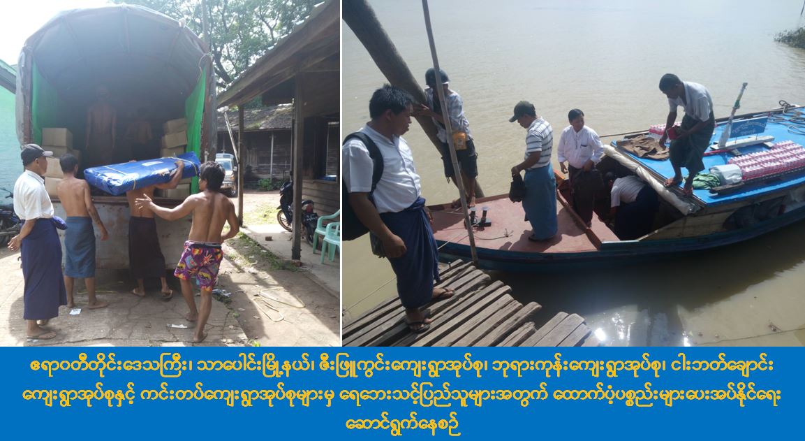 ဧရာ၀တီတိုင်းဒေသကြီးဦးစီးမှူးရုံး (ကဆရ) မှ ဦးသန်းစိုး (ညွှန်ကြားရေးမှူး) နှင့် တာ၀န်ရှိသူများသည် (၄-၁၀-၂၀၁၆) ရက်နေ့တွင် ၂၀၁၆ ခုနှစ်၊ ဇူလိုင်လနှင့် သြဂုတ်လများအတွင်း ရေဘေးဒဏ်ခံစားခဲ့ရသည့် ဧရာ၀တီတိုင်းဒေသကြီး၊ သာပေါင်းမြို့နယ်၊ ဇီးဖြူကွင်းကျေးရွာအုပ်စု၊ ဘုရားကုန်းကျေးရွာအုပ်စု၊ ငါးဘတ်ချောင်းကျေးရွာအုပ်စုနှင့် ကင်းတပ်ကျေးရွာအုပ်စုများမှ ရေဘေးသင့်ပြည်သူများအတွက် ထောက်ပံ့ပစ္စည်းများကို အောက်ပါအတိုင်း ကွင်းဆင်းကာ ထပ်မံထောက်ပံ့ပေးခဲ့ကြောင်း သိရှိရပါသည်-