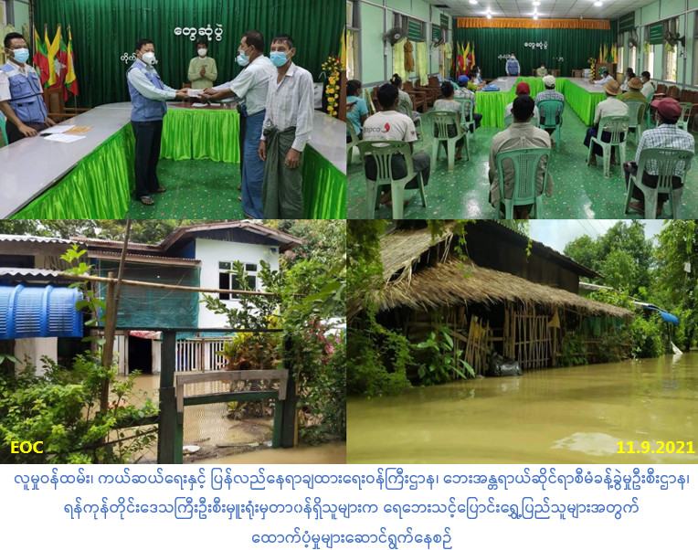 လူမှုဝန်ထမ်း၊ ကယ်ဆယ်ရေးနှင့်ပြန်လည်နေရာချထားရေးဝန်ကြီးဌာန၊ ဘေးအန္တရာယ်ဆိုင်ရာစီမံခန့်ခွဲမှုဦးစီးဌာန၊ ရန်ကုန်တိုင်းဒေသကြီးဦးစီးမှူးရုံးမှတာဝန်ရှိသူများသည် ရန်ကုန်တိုင်းဒေသကြီး၊ ရန်ကုန်မြောက်ပိုင်းခရိုင်၊ တိုက်ကြီးမြို့နယ် ဖလုံဘူတာကျေးရွာအုပ်စုရှိ မာဂရီချောင်း ရေလျှံတတ်လာသောကြောင့် (၁၀-၉-၂၀၂၁)ရက်နေ့၊ (၁ဝး၀၀)နာရီအချိန်တွင် ဖလုံဘူတာ ကျေးရွာအုပ်စု၊ စက်ကြီးကျေးရွာရှိ ဘေးသင့်အိမ်ခြေ(၈၁)လုံး၊ ကျား(၁၄၉)ဦး၊ မ(၁၇၃)ဦး၊ စုစုပေါင်း(၃၂၂)ဦး၊ ညောင်ဝိုင်းကျေးရွာရှိ အိမ်ခြေ(၇၉)လုံး၊ ကျား(၁၅၁)ဦး၊ မ(၁၆၇)ဦး၊ စုစုပေါင်း(၃၁၈)ဦးနှင့် မြို့ကွက်ကျေးရွာမြောက်ခြမ်းရှိ ဘေးသင့်အိမ်ခြေ(၉၉)လုံး၊ ကျား(၁၈၃)ဦး၊ မ(၂၁၈)ဦး၊ စုစုပေါင်း(၄၀၁)ဦး၊ စုစုပေါင်းကျေးရွာ(၃)ရွာတွင် ရေကြီးနစ်မြုပ်၍ ယာယီရွှေ့ပြောင်း လျက်ရှိသည့် အိမ်ခြေ(၂၅၉)၊ ကျား(၄၈၃)ဦး၊ မ(၅၅၈)ဦး၊ စုစုပေါင်း(၁၀၄၁)ဦးတို့အတွတ် ဆန်ရိက္ခာ(၇)ရက်စာဖိုးထောက်ပံ့ငွေ(၂,၁၈၆,၁၀၀/-)ကျပ်အား (၁၁-၉-၂၀၂၁)ရက်နေ့ (၁၁း၀၀) နာရီအချိန်၌ တိုက်ကြီးမြို့နယ် အထွေထွေအုပ်ချုပ်ရေးဦးစီးဌာနမှတာဝန်ရှိသူများနှင့်အတူ ဘေးသင့်ပြည်သူများထံသို့ ထောက်ပံ့ပေးအပ်ခဲ့ပါကြောင်းနှင့် (၁၀-၉-၂၀၂၁)ရက်နေ့ (၁၈း၀၀)နာရီအချိန်တွင် ရေများကျဆင်းသွားသဖြင့် ယာယီရွှေ့ပြောင်းသူများသည် မိမိနေအိမ်များသို့ ပြန်လည်ရောက်ရှိနေထိုင်လျက်ရှိပါကြောင်း သတင်းရရှိပါသည်။