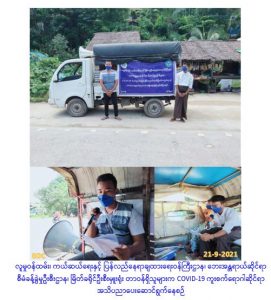 ဘေးအန္တရာယ်ဆိုင်ရာစီမံခန့်ခွဲမှုဦးစီးဌာန၊ မြိတ်ခရိုင်ဦးစီးမှူးရုံးမှ တာဝန်ရှိသူများသည် (၂၁.၉.၂၀၂၁)နေ့တွင် ဂဝေသီစေတနာရှင်များပရဟိတအသင်းနှင့်ပူးပေါင်း၍ Stay at home ကြေညာထားသောနေရာများဖြစ်သည့် မြိတ်မြို့နယ်၊ ဘုတ်ချောင်း၊ ငွေပုလဲ၊ ချောင်းကူးငယ်ရပ်ကွက်တို့တွင် COVID-19 အသက်ရှူလမ်းကြောင်းဆိုင်ရာရောဂါ မဖြစ်ပွားစေရေးအတွက် အများပြည်သူသိရှိလိုက်နာနိုင်ရန် ကျန်းမာရေးနှင့် အားကစားဝန်ကြီးဌာနက ထုတ်ပြန်ထားသော အသိပေးကြေညာချက်များနှင့် သဘာဝဘေးအန္တရာယ်များနှင့်ပတ်သက်၍ ဆောင်ရန်ရှောင်ရန်အချက်များအား အသိပညာပေးခြင်းဆောင်ရွက်ခဲ့ပါကြောင်း သတင်းရရှိပါသည်။