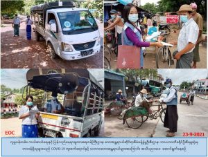လူမှုဝန်ထမ်း၊ ကယ်ဆယ်ရေးနှင့် ပြန်လည်နေရာချထားရေးဝန်ကြီးဌာန၊ ဘေးအန္တရာယ်ဆိုင်ရာစီမံခန့်ခွဲမှု ဦးစီးဌာန၊ သာယာဝတီခရိုင်ဦးစီးမှူးရုံးမှ တာဝန်ရှိသူများသည် (၂၃-၉-၂၀၂၁) ရက်နေ့တွင် (၀၉:၃၀) အချိန်မှ (၁၄:၀၀)အချိန်အထိ နတ္တလင်းမြိုန့ယ်၊ ရပ်ကွက်(၄)ရပ်ကွက်နှင့် ကြို့ပင်ကောက်မြို့နယ်၊ ရပ်ကွက် (၄) ရပ်ကွက်အတွင်း ကိုဗစ်-၁၉ လတ်တလော အသက်ရှူလမ်းကြောင်းဆိုင်ရာ ရောဂါနှင့်ပတ်သက်၍ အများပြည်သူသိရှိ လိုက်နာရန်အချက်များ၊ သဘာဝဘေးအန္တရာယ်ဆိုင်ရာ အသိပညာပေး လုပ်ငန်းများဆောင်ရွက်ခဲ့ပြီး သဘာဝဘေးလက်ကမ်းစာစောင်များ၊ Surgical Maskများကို ပြည်သူလူထုများထံ ဝေငှခဲ့ပါကြောင်း သတင်းရရှိပါသည်။