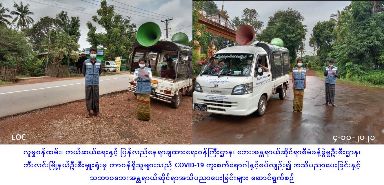 လူမှုဝန်ထမ်း၊ ကယ်ဆယ်ရေးနှင့် ပြန်လည်နေရာချထားရေးဝန်ကြီးဌာန၊ ဘေးအန္တရာယ်ဆိုင်ရာစီမံခန့်ခွဲမှုဦးစီးဌာန၊ ဘီးလင်းမြို့နယ်ဦးစီးမှူးရုံးမှ တာဝန်ရှိသူများသည် (၄-၁၀-၂၀၂၁)ရက်နေ့၊ (၀၉:၃၀ ) နာရီမှ (၁၂:၃၀ )နာရီအချိန်ထိ မွန်ပြည်နယ်၊ သထုံခရိုင်၊ ဘီးလင်းမြို့နယ်၊ ဇွဲကလာကျေးရွာအုပ်စုအတွင်း COVID-19 ရောဂါကူးစက်ပြန့်ပွားမှုမဖြစ်ပွားစေရေးအတွက် လိုက်နာဆောင်ရွက်ရမည့်အချက်များ၊ သဘာဝဘေးအန္တရာယ်နှင့်ပတ်သတ်၍ အသိပညာပေးဆောင်ရွက်ရာတွင် လိုက်နာရမည့် ဆောင်ရန်/ရှောင်ရန်အချက်များကို အသံချဲ့စက်ဖြင့် လှည့်လည်အသိပေးခြင်းများ ဆောင်ရွက်ခဲ့ကြောင်း သိရှိရပါသည်။