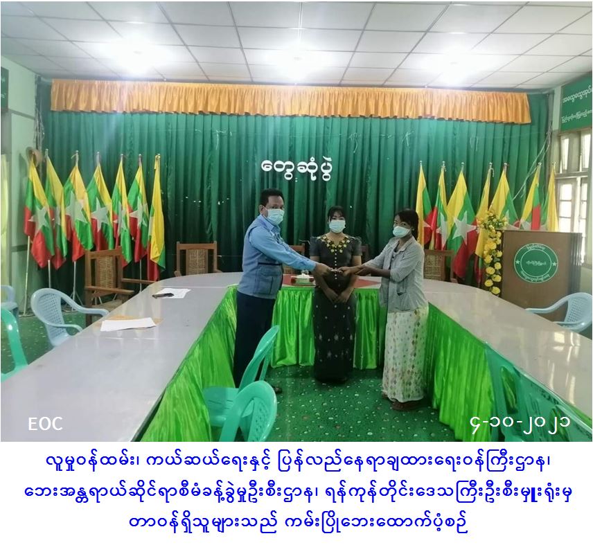 လူမှုဝန်ထမ်း၊ ကယ်ဆယ်ရေးနှင့် ပြန်လည်နေရာချထားရေးဝန်ကြီးဌာန၊ ဘေးအန္တရာယ်ဆိုင်ရာစီမံခန့်ခွဲမှုဦးစီးဌာန၊ ရန်ကုန်တိုင်းဒေသကြီးဦးစီးမှူးရုံးမှ တာဝန်ရှိသူများသည် ရန်ကုန်မြောက်ပိုင်းခရိုင်၊ တိုက်ကြီးမြို့နယ်၊ အဖျောက်မြို့၊ အုန်းပင်ကွင်းကျေးရွာအုပ်စုအတွင်း (၁-၁၀-၂၀၂၁) ရက်နေ့၊ (၀၈:၀၀) နာရီအချိန်တွင် မြစ်ကမ်းပါးပြိုကျမှုကြောင့် ကြိုတင်ဖျက်သိမ်းအိမ်ခြေ(၁)လုံးအတွက် ထောက်ပံ့ငွေ(၁၀၀,၀၀ဝိ/-)၊ လူဦးရေ(၆)ဦးအတွက် ဆန်ရိက္ခာဖိုးငွေ(၁၂,၆၀ဝိ/-)၊ စုစုပေါင်းထောက်ပံ့ငွေ(၁၁၂,၆၀ဝိ/-)တိတိအား (၄-၁၀-၂၀၂၁)ရက်နေ့၊ (၁၀:၀၀)နာရီအချိန်တွင် တိုက်ကြီးမြို့အထွေထွေအုပ်ချုပ်ရေးဦးစီးဌာနမှ တာဝန်ရှိသူများနှင့်အတူ ပြည်သူများ၏ လက်ဝယ်အရောက် ထောက်ပံ့ပေးခဲ့ကြောင်း သိရှိရပါသည်။