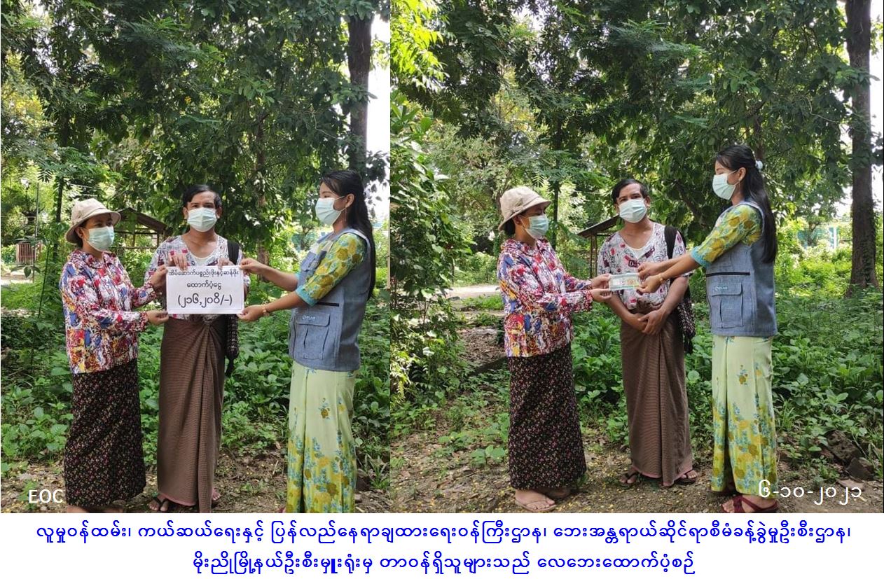 လူမှုဝန်ထမ်း၊ ကယ်ဆယ်ရေးနှင့် ပြန်လည်နေရာချထားရေးဝန်ကြီးဌာန၊ ဘေးအန္တရာယ်ဆိုင်ရာစီမံခန့်ခွဲမှုဦးစီးဌာန၊ မိုးညိုမြို့နယ်ဦးစီးမှူးရုံးမှ တာဝန်ရှိသူများသည် ပဲခူးတိုင်းဒေသကြီး၊သာယာဝတီခရိုင်၊ မိုးညိုမြို့နယ်၊ အင်းတ္တော်လုပ်ကျေးရွာအုပ်စု၊ ပိုးစာကုန်းကျေးရွာနှင့် လေးလံကျေးရွာတို့တွင် (၂၃-၉-၂၀၂၁) ရက်နေ့၌ ဖြစ်ပွားခဲ့သော လေဘေးကြောင့် အမိုးလန်ခဲ့သည့်နေအိမ်(၆)လုံးအတွက် အိမ်ဆောက်ပစ္စည်းဖိုးထောက်ပံ့ငွေ(၁၇၀၀၀၀/-)ကျပ်နှင့်အိမ်ထောင်စု(၆)စုရှိ စုစုပေါင်းလူဦးရေ(၂၂)ဦးအတွက် ဆန်ရိက္ခာ(၇)ရက်စာဖိုးထောက်ပံ့ငွေ(၄၆၂၀၀/-)ကျပ်၊ စုစုပေါင်းထောက်ပံ့ငွေ(၂၁၆၂၀၀/-) ကျပ်တိတိအား (၆-၁၀-၂၀၂၁) ရက်နေ့၊ (၁၃:၀၀)နာရီအချိန်တွင် အင်းတ္တော်လုပ်ကျေးရွာ၊ ကျေးရွာအုပ်ချုပ်ရေးမှူး၊ ရပ်ကျေးစာရေးတို့နှင့်အတူ ဘေးဖြစ်ပွားသူ၏လက်ဝယ်အရောက် ထောက်ပံ့ခဲ့ကြောင်း သတင်းရရှိပါသည်။