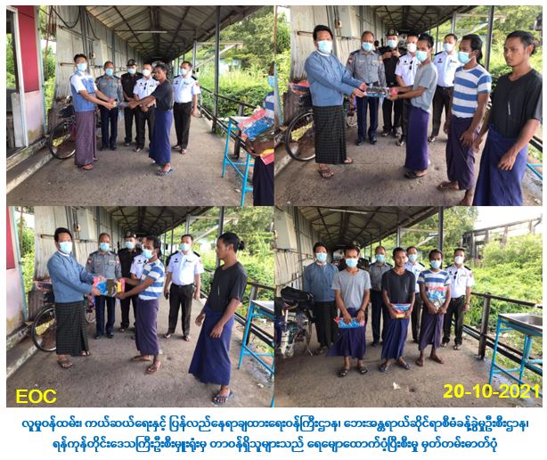 လူမှု၀န်ထမ်း၊ ကယ်ဆယ်ရေးနှင့်ပြန်လည်နေရာချထားရေး၀န်ကြီးဌာန၊ ဘေးအန္တရာယ် ဆိုင်ရာစီမံခန့်ခွဲမှုဦးစီးဌာန၊ ရန်ကုန်တိုင်းဒေသကြီးဦးစီးမှူးရုံးမှ တာဝန်ရှိသူများသည် (၂၀-၁၀-၂၀၂၁)ရက်နေ့၊ (၁၄:၃၀)နာရီအချိန်တွင် ရန်ကုန်အရှေ့ပိုင်းခရိုင်၊ ဗိုလ်တထောင်မြို့နယ်၊ မြန်မာ့ဆိပ်ကမ်းအာဏာပိုင်၊ ရေယာဉ်ငယ်ဌာနခွဲတွင် ရေမျော (၃) ဦီးအား ကယ်ဆယ်ရေး ပစ္စည်း၊ ကျားလုံချည်၊ တီရှပ်နှင့်ဆပ်ပြာတို့အား ဆိပ်ကမ်းအာဏာပိုင်၊ ရေကြောင်းရဲတပ်ဖွဲ့၊ လူဝင်မှုကြီးကြပ်ရေးမှ ဝန်ထမ်းများနှင့်အတူ သွားရောက်ထောက်ပံ့ခဲ့ကြောင်း သတင်းရရှိ ပါသည်။
