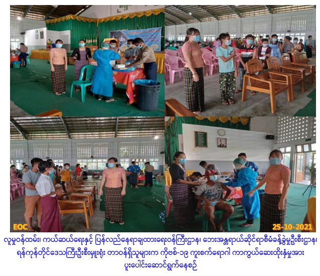 လူမှုဝန်ထမ်း၊ ကယ်ဆယ်ရေးနှင့် ပြန်လည်နေရာချထားရေးဝန်ကြီးဌာန၊ ဘေးအန္တရာယ်ဆိုင်ရာစီမံခန့်ခွဲမှုဦးစီးဌာန၊ ရန်ကုန်တိုင်းဒေသကြီးဦးစီးမှူးရုံးမှ တာဝန်ရှိသူများသည် (၂၅.၁၀.၂၀၂၁)ရက်နေ့တွင် ရန်ကုန်အနောက်ပိုင်းခရိုင်၊ မရမ်းကုန်းမြို့နယ်အတွင်းရှိ (၁၂)နှစ်အထက် ကျောင်းသား/ သူများ ကိုဗစ်-၁၉ ကူးစက်ရောဂါ ကာကွယ်ဆေးထိုးနှံခြင်းအား မြို့နယ်ထွေ/အုပ်၊ ပညာရေး၊ ကျန်းမာရေး၊ လူမှုဝန်ထမ်း၊ ကြက်ခြေနီ၊ စေတနာ့ဝန်ထမ်းများနှင့်အတူ ပူးပေါင်းပါဝင်ဆောင်ရွက်ခဲ့ပါကြောင်း သတင်းရရှိပါသည်။