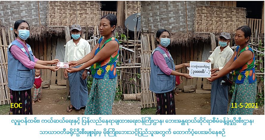 လူမှုဝန်ထမ်း၊ ကယ်ဆယ်ရေးနှင့် ပြန်လည်နေရာချထားရေးဝန်ကြီးဌာန၊ ဘေးအန္တရာယ်ဆိုင်ရာစီမံခန့်ခွဲမှုဦးစီးဌာန၊ သာယာဝတီခရိုင်ဦးစီးမှူးမှ တာဝန်ရှိသူများသည် (၄-၁၁-၂၀၂၁) ရက်နေ့ (၁၅:၃၀) အချိန်၌ သာယာဝတီခရိုင်၊ နတ်တလင်းမြို့နယ်၊ ကံသာကျေးရွာအုပ်စု၊ ဇီးတောကျေးရွာနေသူသည် ပေါင်းတည်မြို့နယ်၊ မကျီးပင်ကျေးရွာအုပ်စု၊ ပေါက်တန်းကျေးရွာ လယ်ကွင်းတွင် ကောက်ရိတ်နေစဥ် ဖြစ်ပွားသော မိုးကြိုးဘေးမှ သေဆုံး(၁)ဦးအတွက် ထောက်ပံ့ငွေ (၃၀၀,၀၀ဝ) ကျပ်အား (၅-၁၁-၂၀၂၁) ရက်နေ့ (၁၂:၃၀) နာရီအချိန်တွင် မြို့နယ်အထွေထွေအုပ်ချုပ်ရေးဦးစီးဌာနမှတာဝန်ရှိသူများ၊ ရပ်ကျေးစာရေး၊ ရပ်ကွက်/ကျေးရွာ အုပ်ချုပ်ရေးမှူးများ၊ ရပ်မိ/ရပ်ဖများနှင့်အတူ ဘေးဖြစ်ပွားသူနေထိုင်ရာကံသာကျေးရွာအုပ်စု၊ ဇီးတောကျေးရွာသို့သွားရောက်၍ ဇနီးဖြစ်သူ၏လက်ဝယ်အရောက် ထောက်ပံ့ပေးအပ်ခဲ့ပါကြောင်း သတင်းရရှိပါသည်။