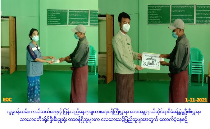 လူမှုဝန်ထမ်း၊ ကယ်ဆယ်ရေးနှင့် ပြန်လည်နေရာချထားရေးဝန်ကြီးဌာန၊ ဘေးအန္တရာယ်ဆိုင်ရာစီမံခန့်ခွဲမှုဦးစီးဌာန၊ ပဲခူးတိုင်းဒေသကြီး၊ သာယာဝတီခရိုင်ဦးစီးမှူးရုံးမှ တာဝန်ရှိသူများသည် (၂၈-၁၀-၂၀၂၁)ရက်နေ့(၀၄း၃၀)အချိန်၌ သာယာဝတီခရိုင်၊ မင်းလှမြို့နယ်၊လှည်းကူးကျေးရွာအုပ်စု၊ ရေကြည်ကျေးရွာတွင်ဖြစ်ပွားသောလေဘေးမှ တစ်စိတ်တစ်ပိုင်းပျက်စီးနေအိမ်(၁)လုံးအတွက် အိမ်ဆောက်ပစ္စည်းဖိုးထောက်ပံ့ငွေ(၃၀၀၀ဝိ/-)ကျပ်၊ အိမ်ထောင်စု(၁)စုရှိ လူဦးရေ(၆)ဦးတို့အတွက် ဆန်ဖိုးထောက်ပံ့ငွေ(၁၂၆၀၀ိ/-)၊ စုစုပေါင်းထောက်ပံ့ငွေ(၄၂၆၀၀ိ/-)တို့အား(၁-၁၁-၂၀၂၁)ရက်နေ့(၁၀းဝဝ)နာရီအချိန်တွင် မြို့နယ်အထွေထွေအုပ်ချုပ်ရေးဦးစီးဌာနမှ မြို့နယ်အုပ်ချုပ်ရေးမှူးနှင့်တာဝန်ရှိသူများ၊ ရပ်ကျေးစာရေး၊ ရပ်ကွက်/ကျေးရွာအုပ်ချုပ်ရေးမှူးများ၊ ရပ်မိ/ရပ်ဖများနှင့်အတူ ဘေးသင့်ပြည်သူများလက်ဝယ်အရောက် ထောက်ပံ့ပေးအပ်ခဲ့ပါကြောင်း သတင်းရရှိပါသည်။