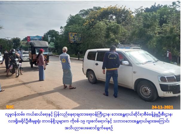 လူမှုဝန်ထမ်း၊ ကယ်ဆယ်ရေးနှင့်ပြန်လည်နေရာချထားရေးဝန်ကြီးဌာန၊ ဘေးအန္တရာယ်ဆိုင်ရာစီမံခန့်ခွဲမှုဦးစီးဌာန၊ လားရှိုးခရိုင်ဦးစီးမှူးရုံးမှ တာဝန်ရှိသူများသည် (၂၄.၁၁.၂၀၂၁)ရက်နေ့တွင် လာရှိုးမြို့၊ ပြည်ထောင်စုလမ်းမကြီးပေါ်ရှိ မြို့အဝင်မုခ်ဦးဂိတ်၌ ဌာနဆိုင်ရာများ၊ ရပ်ကွက်လူမှုရေးအသင်းအဖွဲ့များနှင့်ပူးပေါင်းပြီး လားရှိုးမြို့နေပြည်သူများ ကိုဗစ်-၁၉ ကူးစက်ရောဂါ ကြိုတင်ကာကွယ်နိုင်ရန်အတွက် ကျန်းမာရေးနှင့်အားကစားဝန်ကြီးဌာနမှ Stay at Home မြို့များအတွက်ထုတ်ပြန်ထားသော အသိပညာပေးစာသားများကို ဖတ်ကြားခြင်းနှင့် သဘာဝဘေးအသိပညာပေးလက်ကမ်းစာစောင်များ ဖြန့်ဝေခြင်းတို့ကို ဆောင်ရွက်ခဲ့ပါကြောင်း သတင်းရရှိပါသည်။