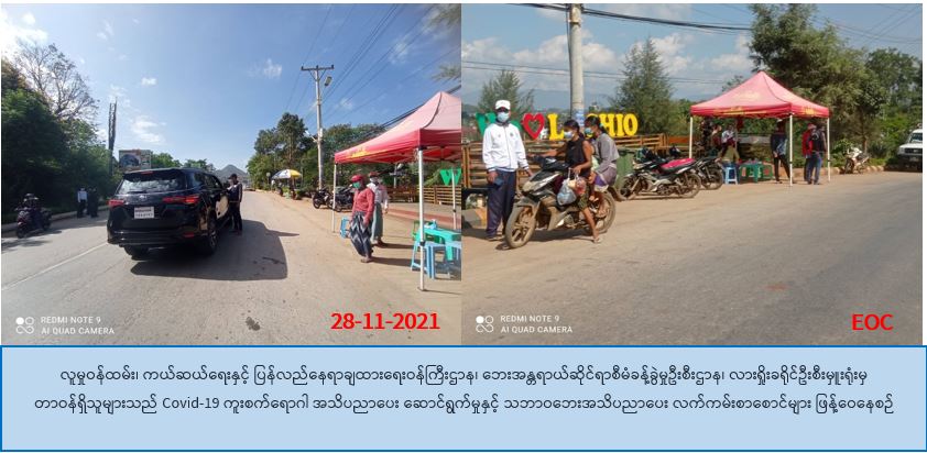 လူမှုဝန်ထမ်း၊ ကယ်ဆယ်ရေးနှင့် ပြန်လည်နေရာချထားရေးဝန်ကြီးဌာန၊ ဘေးအန္တရာယ်ဆိုင်ရာ စီမံခန့်ခွဲမှုဦးစီးဌာန၊ လားရှိုးခရိုင်ဦးစီးမှူးရုံးအနေဖြင့် ဌာနဆိုင်ရာများ၊ ရပ်ကွက်လူမှုရေးအသင်းအဖွဲ့များ နှင့်ပူးပေါင်းပြီး လားရှိုးမြို့နေပြည်သူများ COVID-19 ကြိုတင်ကာကွယ်နိုင်ရန် ရည်ရွယ်၍ ကျန်းမာရေးနှင့် အားကစားဝန်ကြီးဌာနမှ Stay at Home မြို့များအတွက် ထုတ်ပြန်ထားသော အသိပညာပေးစာသားများကို ဖတ်ကြားခြင်းနှင့် သဘာဝဘေးအသိပညာပေး လက်ကမ်းစာစောင်များ ဖြန့်ဝေခြင်းကို (၂၈.၁၁.၂၀၂၁) ရက်နေ့၌ မိမိတို့ဌာနတာဝန်ကျသည့် ပြည်ထောင်စုလမ်းမကြီး၊ လားရှိုးမြို့အဝင်မုခ်ဦးဂိတ်၌ ဆောင်ရွက်ခဲ့ပါကြောင်း သတင်းရရှိပါသည်။