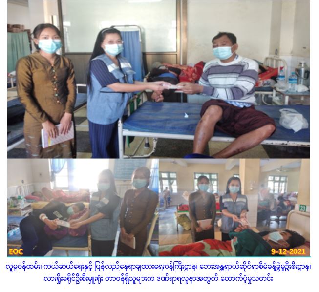 လူမှုဝန်ထမ်း၊ ကယ်ဆယ်ရေးနှင့်ပြန်လည်နေရာချထားရေးဝန်ကြီးဌာန၊ ဘေးအန္တရာယ်ဆိုင်ရာစီမံခန့်ခွဲမှုဦးစီးဌာန၊ လားရှိုးခရိုင်ဦးစီးမှူးရုံးမှ တာဝန်ရှိသူများသည် (၇-၁၂-၂၀၂၁) ရက်နေ့တွင် သိန္နီမြို့နယ်၊ ပန်လော့ကျေးရွာအုပ်စု၊ ပန်လော့ကျေးရွာတွင် လက်နက်ကြီးစထိမှန်ခဲ့သော ဒဏ်ရာရလူနာ (၃)ဦးအတွက် (၁)ဦးလျှင်ထောက်ပံ့ငွေ (၅၀၀၀၀)နှုန်းဖြင့် ထောက်ပံ့ငွေ (၁၅၀၀၀၀/-) ကျပ်အား (၇-၁၂-၂၀၂၁) ရက်နေ့တွင် ထောက်ပံ့ပေးအပ်ခဲ့ပါကြောင်း သတင်းရရှိပါသည်။