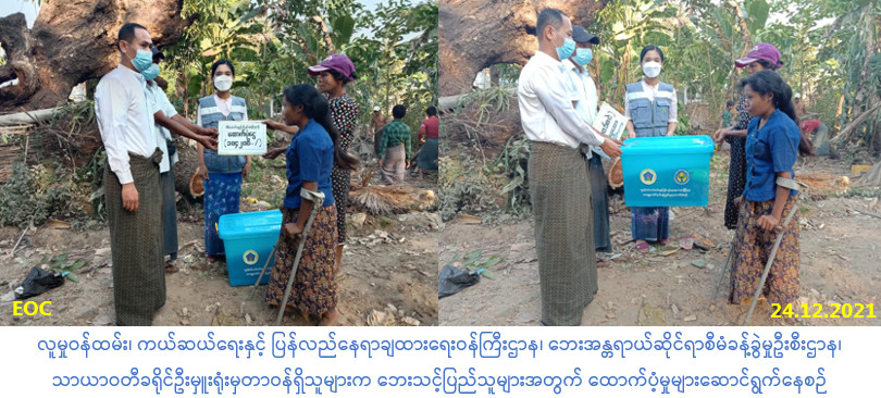 လူမှုဝန်ထမ်း၊ ကယ်ဆယ်ရေးနှင့်ပြန်လည်နေရာချထားရေးဝန်ကြီးဌာန၊ ဘေးအန္တရာယ်ဆိုင်ရာစီမံခန့်ခွဲမှုဦးစီးဌာန၊ သာယာဝတီခရိုင်ဦးမှူးရုံးမှတာဝန်ရှိသူများသည် (၂၄-၁၂-၂၀၂၁)ရက်နေ့ (၀၈း၁၀)အချိန်၌ သာယာဝတီခရိုင်၊ သာယာဝတီမြို့နယ်၊ တောင်ပန်းဆွဲကျေးရွာအုပ်စု၊ တောင်ဖလံကုန်းကျေးရွာတွင် သက်တမ်းရင့်ကုက္ကိုပင်အောက်ခြေဆွေးမြေ့၍ ပြိုလဲမှုဖြစ်ပွားခဲ့ခြင်းကြောင့် သစ်ပင်ပိပြိုလဲပျက်စီးလူနေအိမ်(၁)လုံးအတွက် အိမ်ဆောက်ပစ္စည်းဖိုးထောက်ပံ့ငွေ(၁၀၀,၀၀ဝ/-)ကျပ်၊ အိမ်ထောင်စု(၁)စုရှိလူဦးရေ(၂)ဦးတို့အတွက် ဆန်ရိက္ခာဖိုးထောက်ပံ့ငွေ(၄,၂၀၀/-)ကျပ်၊ စုစုပေါင်းထောက်ပံ့ငွေ(၁၀၄,၂၀၀/-)ကျပ်နှင့် လေးထောင့်ပလပ်စတစ်ပုံးအပါ ကယ်ဆယ်ရေးပစ္စည်း(၁၇)မျိုး အိမ်ထောင်(၁)စုစာတန်ဖိုးငွေ(၄၉,၀၃၆/)ကျပ်နှင့် ကတ္ထူစက္ကူပုံး(၁)ပုံးတို့အား (၂၄-၁၂-၂၀၂၁)ရက်နေ့၊ (၁၅း၃၀)နာရီအချိန်၌ မြို့နယ်အထွေထွေ အုပ်ချုပ်ရေးဦးစီးဌာနမှ တာဝန်ရှိသူများ၊ ရပ်ကျေးစာရေး၊ ကျေးရွာအုပ်ချုပ်ရေးမှူးများ၊ ရပ်မိ/ရပ်ဖများနှင့်အတူ ဖလံကုန်းကျေးရွာတွင် ဘေးသင့်ပြည်သူများ၏ လက်ဝယ်အရောက် ထောက်ပံ့ပေးအပ်ခဲ့ပါကြောင်း သတင်းရရှိပါသည်။