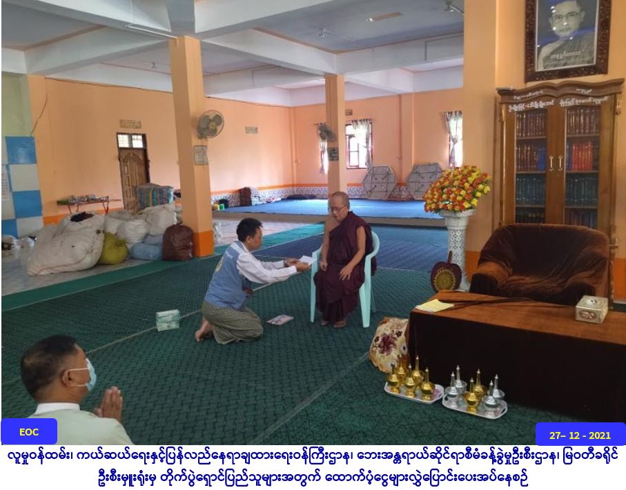 လူမှုဝန်ထမ်း၊ ကယ်ဆယ်ရေးနှင့်ပြန်လည်နေရာချထားရေးဝန်ကြီးဌာန၊ ဘေးအန္တရာယ်ဆိုင်ရာစီမံခန့်ခွဲမှုဦးစီးဌာန မြဝတီခရိုင်ဦးစီးမှူးရုံးမှ တာဝန်ရှိသူများသည် မြဝတီမြို့နယ်၊ မဲ့ထော်သလေးကျေးရွာအုပ်စု၊ မေတ္တာလင်းမြိုင်ကျေးရွာနှင့် ဖလူးကျေးရွာအုပ်စု၊ အင်ကြင်းမြိုင်ကျေးရွာတို့မှ မြဝတီမြို့၊ အမှတ်(၄)ရပ်ကွက်၊ ကျောက်လုံးကြီးဘုန်းတော်ကြီးကျောင်းနှင့် မဟာစည်ဘုန်းတော်ကြီးကျောင်းများသို့ တိုက်ပွဲရှောင်ရောက်ရှိလာသော အိမ်ထောင်စု (၂၇)စုမှ ကျား (၅၆)ဦး၊ မ(၉၆)ဦး စုစုပေါင်းလူဦးရေ (၁၅၂)ဦး အတွက် (၇)ရက်စာ ဆန်ဘိုးထောက်ပံ့ငွေ (၃၁၉၂၀၀/-)ကျပ်နှင့် Mask များအား မြဝတီခရိုင်စီမံအုပ်ချုပ်ရေးအဖွဲ့တာဝန်ရှိသူများ နှင့်အတူ (၂၇-၁၂-၂၀၂၁) ရက်နေ့ (၁၃:၃၀) နာရီအချိန်တွင် သွားရောက်ထောက်ပံ့ပေးခဲ့ပါကြောင်း သတင်းရရှိပါသည်။
