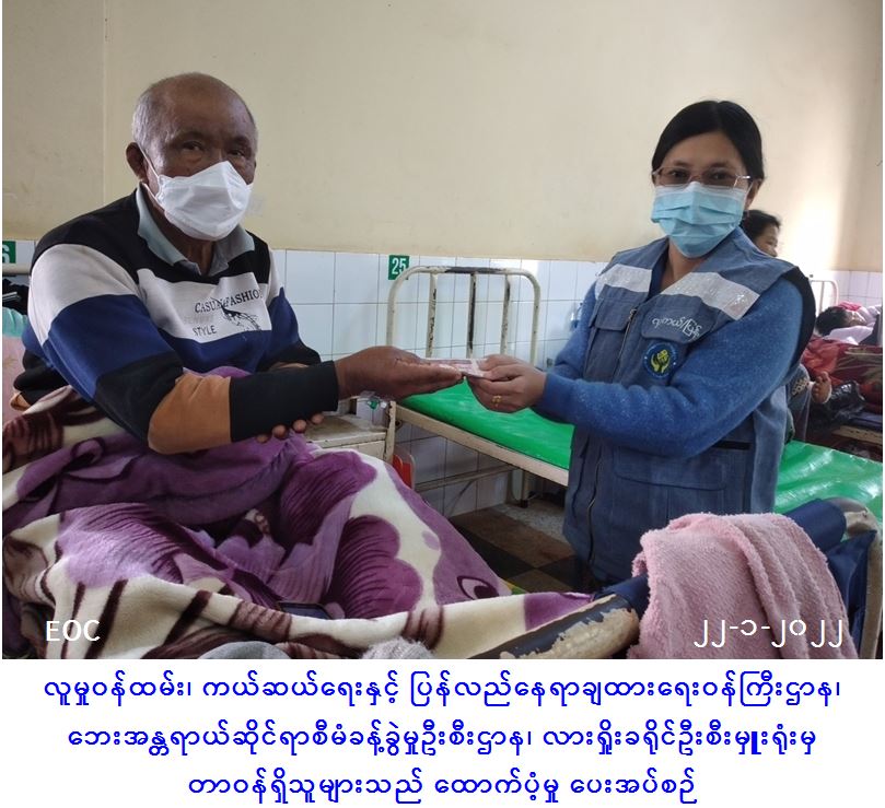 လူမှုဝန်ထမ်း၊ ကယ်ဆယ်ရေးနှင့် ပြန်လည်နေရာချထားရေးဝန်ကြီးဌာန၊ ဘေးအန္တရာယ်ဆိုင်ရာစီမံခန့်ခွဲမှုဦးစီးဌာန၊ လားရှိုးခရိုင်ဦးစီးမှူးရုံးမှ တာဝန်ရှိသူများသည် ကျောက်မဲမြို့နယ်၊ မိုင်းတင်းကျေးရွာအုပ်စု၊ ပင်တီးကျေးရွာ၌ (၁၀-၁-၂၀၂၂) ရက်နေ့၊ (၁၃:၃၀) နာရီအချိန်ခန့်တွင် ကြိုးမိုင်းအားထိမိ၍ ယာဘက်ပေါင် မိုင်းစဖောက်ဝင်၊ ဝဲဘက်ခြေသလုံး မိုင်းစဖောက်ဝင် ဒဏ်ရာရရှိခဲ့သည့် ဦးဘောဂ(အသက် ၇၂ နှစ်၊ ရှမ်း/ဗုဒ္ဓ) အတွက် ထောက်ပံ့ငွေ(၅၀၀၀၀/-)ကျ်တိတိအား (၂၂-၁-၂၀၂၂)ရက်နေ့တွင် ထောက်ပံ့ပေးအပ်ခဲ့ကြောင်း သတင်းရရှိပါသည်။