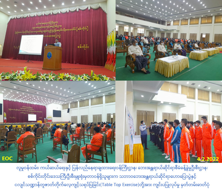 လူမှုဝန်ထမ်း၊ ကယ်ဆယ်ရေးနှင့် ပြန်လည်နေရာချထားရေးဝန်ကြီးဌာန၊ ဘေးအန္တရာယ်ဆိုင်ရာစီမံခန့်ခွဲမှုဦးစီးဌာန၊ စစ်ကိုင်းတိုင်းဒေသကြီးဦးစီးမှူးရုံးမှတာဝန်ရှိသူများသည် (၄-၂-၂ဝ၂၂) နေ့တွင် စစ်ကိုင်းမြို့၊ ပြည်ထောင်စုတိုင်းရင်သားလူငယ်များစွမ်းရည်ဖွံ့ဖြိုးရေးဒီဂရီကော လိပ်(စစ်ကိုင်း)တွင် ဆရာ/ ဆရာမ (၅၂)ဦး၊ ကျောင်းသား/ သူ (၅၉)ဦး စုစုပေါင်း(၁၁၁)ဦးတို့အား သဘာဝဘေးအန္တရာယ်ဆိုင်ရာ ကြိုတင်ကာကွယ်ခြင်း၊ တုံ့ပြန်ဆောင်ရွက်ခြင်းနှင့် ပြန်လည်ထူ ထောင်ရေးဆိုင်ရာ အသိပညာပေးဟောပြောခြင်းနှင့် ငလျင်သဏ္ဍာန်တူဇာတ်တိုက်လေ့ကျင့်သရုပ်ပြခြင်း (Table Top Exercise)အား ဆောင်ရွက်ခဲ့ပါကြောင်း သတင်းရရှိပါသည်။