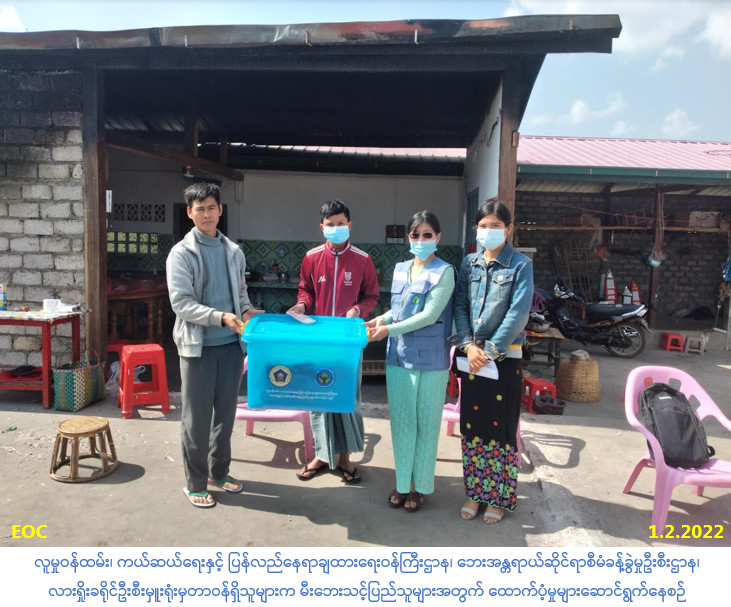 လူမှုဝန်ထမ်း၊ ကယ်ဆယ်ရေးနှင့်ပြန်လည်နေရာချထားရေးဝန်ကြီးဌာန၊ ဘေးအန္တရာယ်ဆိုင်ရာစီမံခန့်ခွဲမှုဦးစီးဌာန၊ လားရှိုးခရိုင်ဦးစီးမှူးရုံးမှတာဝန်ရှိသူများသည် (၂၆-၁-၂၀၂၂)ရက်နေ့ (၁၂:၃၀)အချိန်ခန့်တွင် လားရှိုးမြို့၊ ရက်ကွက်(၅)၊ နမ(၁၃)၊ (၅၆)လမ်း၊ အိမ်အမှတ်(င/၁၃/၆၃)၌ ခြင်ဆေးခွေမှ မီးကူးစက်လောင်ကျွမ်းမှုဖြစ်ပွားခဲ့ရာ အဆိုပါ မီးဘေးသင့်နေအိမ်(၁)လုံးအတွက် ထောက်ပံ့ငွေ(၂၀၀,၀၀၀/-)ကျပ်၊ လူဦးရေ(၇)ဦးအတွက် ဆန်(၇)ရက်စာဖိုးထောက်ပံ့ငွေ (၁၄,၇၀၀/-)ကျပ်နှင့် ကယ်ဆယ်ရေးပစ္စည်း(၂၂)မျိုး အိမ်ထောင်စု(၁)စုစာအား (၁-၂-၂၀၂၂) ရက်နေ့တွင် မီးဘေးသင့်ပြည်သူများထံ ထောက်ပံ့ပေးအပ်ခဲ့ပါကြောင်း သတင်းရရှိပါသည်။