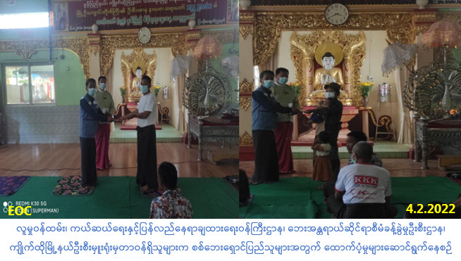 လူမှုဝန်ထမ်း၊ ကယ်ဆယ်ရေးနှင့် ပြန်လည်နေရာချထားရေးဝန်ကြီးဌာန၊ ဘေးအန္တရာယ်ဆိုင်ရာစီမံခန့်ခွဲမှုဦးစီးဌာန၊ ကျိုက်ထိုမြို့နယ်ဦးစီးမှူးရုံးမှတာဝန်ရှိသူများသည်၊ ကျိုက်ထိုမြို့နယ်၊ သိမ်ဇရပ်မြို့၊ အမှတ်(၂)ရပ်ကွက်၊ မြို့ဦးကျောင်းတိုက်နှင့် သီတာရုံကျောင်းတိုက်တို့၌ စစ်ဘေးကြောင့် ပြောင်းရွှေ့နေထိုင်ခိုလှုံသူ အိမ်ထောင်စု(၃၃)စု၊ ကျား(၅၈)ဦး၊ မ(၇၃)ဦး၊ စုစုပေါင်း(၁၃၁)ဦး တို့အတွက် (၇)ရက်စာ ဆန်ရိက္ခာဖိုးထောက်ပံ့ငွေ(၂၇၅,၁၀ဝ/-)ကျပ်အား (၄-၂-၂၀၂၂) ရက်နေ့၊ (၁၄:၀၀)နာရီအချိန်တွင် ထောက်ပံ့ပေးအပ်ခဲ့ပါကြောင်း သတင်းရရှိပါသည်။