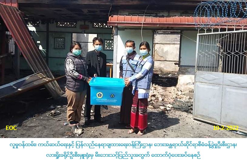 လူမူဝန်ထမ်း၊ ကယ်ဆယ်ရေးနှင့် ပြန်လည်နေရာချထားရေးဝန်ကြီးဌာန၊ ဘေးအန္တရာယ်ဆိုင်ရာစီမံခန့်ခွဲမှု ဦးစီးဌာန၊ လားရှိုးခရိုင်ဦးစီးမှူးရုံးမှ တာဝန်ရှိသူများသည် (၉-၂-၂၀၂၂) ရက်နေ့ (ဝ၈:၄၅)ချိန်ခန့်တွင် လားရှိုးမြို့၊ ရက်ကွက် (၈)၊ နမ(၈)၊ အင်ကြင်းလမ်းရှိ နေအိမ်အတွင်း ထမင်းပေါင်းအိုးတည်ထားခဲ့ရာ အပူလွန်ကဲ၍ မီးကူးဆက်လောင်ကျွမ်းခဲ့ပါသဖြင့် မီးဘေးသင့်နေအိမ်(၁)လုံးအတွက် ထောက်ပံ့ငွေ (၂၀၀,၀၀၀)ကျပ်၊ လူဦးရေ(၂)ဦးအတွက် ဆန်(၇)ရက်စာ (၄,၂၀၀)ကျပ်၊ ကယ်ဆယ်ရေးပစ္စည်း(၂၂)မျိုးအိမ်ထောင်စု(၁)စုစာအား (၁၀-၂-၂၀၂၂) ရက်နေ့တွင် ဘေးသင့်ပြည်သူများထံသို့ လက်ဝယ်အရောက်ထောက်ပံ့ပေးအပ်ခဲ့ပါကြောင်း သတင်းရရှိပါသည်။