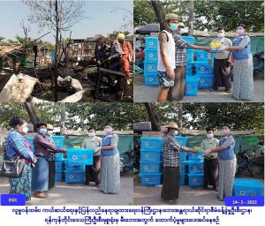 လူမှုဝန်ထမ်း၊ ကယ်ဆယ်ရေးနှင့် ပြန်လည်နေရာချထားရေးဝန်ကြီးဌာန၊ ဘေးအန္တရာယ်ဆိုင်ရာစီမံခန့်ခွဲမှုဦးစီးဌာန၊ ရန်ကုန်တိုင်းဒေသကြီး ဦးစီးမှူးရုံးမှ တာဝန်ရှိသူများသည် ရန်ကုန်တိုင်းဒေသကြီး၊ အင်းစိန် မြို့နယ်၊ မြို့သစ်(ဂ) ရပ်ကွက်၊ ပိတောက်လမ်းတွင် (၁၂-၂-၂၀၂၂) ရက်နေ့၊ (၁၁း၃၀)နာရီအချိန်၌ မီးလောင်မှုဖြစ်ပွားခဲ့ရာ ဓနိမိုး/ဓနိကာ ကျူးကျော်နေအိမ် (၂၀)လုံးမီးဘေးသင့်ခဲ့ပြီး၊ အိမ်ထောင်စု (၂၀)စုမှ လူဦးရေ (၇၂)ဦးတို့ မီးဘေးသင့်ခဲ့ပါသဖြင့် လူဦးရေ (၇၂)ဦးအတွက် ဆန်ရိက္ခာဖိုးထောက်ပံ့ငွေကျပ် (၁၅၁၂၀၀/-)၊ ကယ်ဆယ်ရေးပစ္စည်း (၁၇)မျိုး (၂၀)အိမ်ထောင်စာနှင့် ကိုဗစ်-၁၉ ကြိုတင်ကာကွယ်နိုင် ရေးအတွက် အိမ်ထောင်စု (၂၀)စုအတွက် ဆပ်ပြာ (၂၀)တောင့်၊ လူဦးရေ (၇၂)ဦးအတွက် Mask (၁၄၄) ခုတို့အား အထွေထွေ အုပ်ချုပ်ရေးဦးစီးဌာနမှ တာဝန်ရှိသူများနှင့်အတူ ဘေးသင့်ပြည်သူ များထံသို့ (၁၄-၂-၂၀၂၀) ရက်နေ့ (၁၅း၃၀)နာရီအချိန်တွင် သွားရောက်၍ ထောက်ပံ့ပေးအပ်ခဲ့ပါကြောင်း သတင်းရရှိပါသည်။