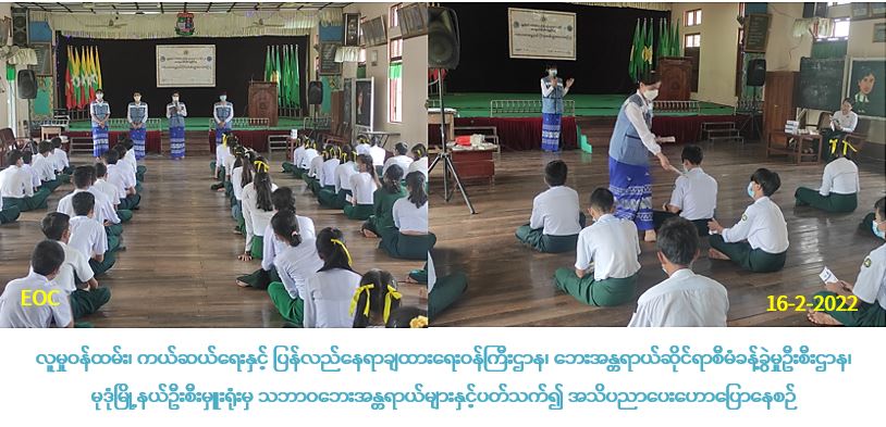 လူမှုဝန်ထမ်း၊ ကယ်ဆယ်ရေးနှင့် ပြန်လည်နေရာချထားရေးဝန်ကြီးဌာန၊ ဘေးအန္တရာယ်ဆိုင်ရာစီမံခန့်ခွဲမှု ဦးစီးဌာန၊ မုဒုံမြို့နယ်ဦးစီးမှူးရုံးမှ တာဝန်ရှိသူများသည် (၁၆-၂-၂၀၂၂) ရက်နေ့၊ (၁၁:၀၀) နာရီအချိန်မှ (၁၂:၀၀) နာရီအချိန်အထိ မွန်ပြည်နယ်၊ မော်လမြိုင်ခရိုင်၊ မုဒုံမြို့အမှတ်(၂) အခြေခံပညာအထက်တန်းကျောင်း၊ ပညာရတနာခန်းမတွင် သဘာဝဘေးအန္တရာယ်ဆိုင်ရာအသိပညာပေး ဟောပြောဆွေနွေးခြင်း၊ လက်ကမ်းစာစောင်များဖြန့်ဝေခြင်းတို့အား ဆောင်ရွက်ခဲ့ပြီး ဟောပြောပွဲသို့ ကျောင်းသား/သူ (၁၀၀)ဦးခန့် တက်ရောက်ခဲ့ပါကြောင်း သတင်းရရှိပါသည်။