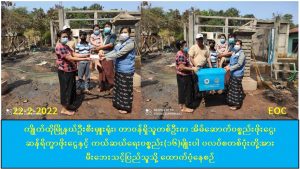 လူမှုဝန်ထမ်း၊ ကယ်ဆယ်ရေးနှင့်ပြန်လည်နေရာချထားရေးဝန်ကြီးဌာန၊ ဘေးအန္တရာယ်ဆိုင်ရာ စီမံခန့်ခွဲမှုဦးစီးဌာန၊ ကျိုက်ထိုမြို့နယ်ဦးစီးမှူးရုံးမှ တာဝန်ရှိသူများသည် ကျိုက်ထိုမြို့နယ်၊ စစ်တောင်းကျေးရွာအုပ်စု၊ အေးသီတာရပ်ကွက်၌ (၂၀-၂-၂၀၂၂)ရက်နေ့၊ (၁၅:၀၀)နာရီ အချိန်တွင် မီးလောင်မှုကြောင့် ပျက်စီးဆုံးရှုံးခဲ့သည့် လူနေတိုက်အိမ်(၁)လုံးမှ အိမ်ထောင်စု (၁)စုအတွက် တန်ဖိုးငွေ(၄၆,၀၃၆/-)ရှိ ကယ်ဆယ်ရေးပစ္စည်း(၁၆)မျိုး၊ အိမ်ဆောက်ပစ္စည်းဖိုး ထောက်ပံ့ငွေ(၂၀၀,၀၀ဝိ/-)နှင့်မီးဘေးသင့်ပြည်သူ(၅)ဦးတို့အတွက် (၇)ရက်စာ ဆန်ရိက္ခာဖိုးငွေ (၁၀,၅၀ဝိ/-)အား (၂၂-၂-၂၀၂၂)ရက်နေ့ (၁၃:၃၀)အချိန်တွင် ထောက်ပံ့ပေးခဲ့ပြီး စုစုပေါင်း ထောက်ပံ့မှုတန်ဖိုးမှာ (၂၁၀,၅၀ဝိ/-)ဖြစ်ကြောင်း သတင်းရရှိပါသည်။