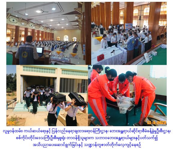 လူမှုဝန်ထမ်း၊ ကယ်ဆယ်ရေးနှင့် ပြန်လည်နေရာချထားရေးဝန်ကြီးဌာန၊ ဘေးအန္တရာဆိုင်ရာစီမံခန့်ခွဲမှုဦးစီးဌာန၊ စစ်ကိုင်းတိုင်းဒေသကြီးဦးစီးမှူးရုံးမှ တာဝန်ရှိသူများသည် (၁၀-၃-၂ဝ၂၂) နေ့တွင် စစ်ကိုင်းမြို့၊ ပြည်ထောင်စုတိုင်းရင်သားလူမျိုးများဖွံဖြိုးရေးတက္ကသိုလ်တွင် ဆရာ/ဆရာမ (၁၂)ဦး၊ ကျောင်းသား/သူ (၁၅၀)ဦး စုစုပေါင်း(၁၆၂)ဦး တို့အား သဘာဝဘေးအန္တရယ်နှင့်ပတ်သက်၍ ကြိုတင်ကာကွယ်ခြင်း၊ တုံ့ပြန်ဆောင်ရွက်ခြင်းနှင့် ပြန်လည်ထူထောင်ခြင်းဆိုင်ရာ အသိပညာပေးဟောပြောဆောင်ရွက်ခဲ့ပြီး ငလျင်သဏ္ဍာန်တူဇာတ်တိုက်လေ့ကျင့်သရုပ်ပြခြင်းအား ဆောက်ရွက်ခဲ့ပါကြောင်း သတင်းရရှိပါသည်။