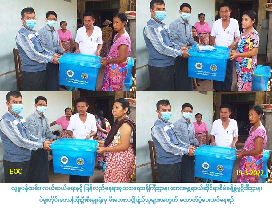 လူမှုဝန်ထမ်း၊ ကယ်ဆယ်ရေးနှင့် ပြန်လည်နေရာချထားရေးဝန်ကြီးဌာန၊ ဘေးအန္တရာယ်ဆိုင်ရာစီမံခန့်ခွဲမှုဦးစီးဌာန၊ ပဲခူးတိုင်းဒေသကြီးဦးစီးမှူးရုံးမှ တာဝန်ရှိသူများသည် (၁၉-၃-၂၀၂၂) ရက်နေ့၊ (၁၆:၀၀) နာရီအချိန်ခန့်တွင် ပဲခူးခရိုင်၊ ပဲခူးမြို့နယ်၊ ဇိုင်းဂနိုင်းတောင်ပိုင်းရပ်ကွက်၊ ကံကြီးပိုင်းလမ်းတွင်ဖြစ်ပွားခဲ့သော မီးဘေးမှအိမ်ထောင်စု(၃)စု၊ လူဦးရေ(၁၀)ဦးအတွက် ကယ်ဆယ်ရေးပစ္စည်း(၁၇)မျိုး၊ တန်ဖိုးငွေ(၁၄၇,၁၀ဝ)ကျပ်နှင့် လူ(၁)ဦးလျှင် Mask (၂)ခုနှုန်းဖြင့် Mask (၂၀) ခုတို့အား (၁၉-၃-၂၀၂၂) ရက်နေ့ (၁၃:၃၀) နာရီအချိန်တွင် ရပ်ကွက်အုပ်ချုပ်ရေးမှူးနှင့်အတူ ပြည်သူလက်ဝယ်အရောက်ထောက်ပံ့ပေးအပ်ခဲ့ပါကြောင်း သတင်းရရှိပါသည်။