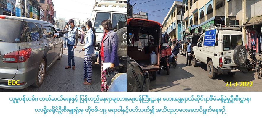 လူမှုဝန်ထမ်း၊ ကယ်ဆယ်ရေးနှင့်ပြန်လည်နေရာချထားရေးဝန်ကြီးဌာန၊ ဘေးအန္တရာယ်ဆိုင်ရာစီမံခန့်ခွဲမှုဦးစီးဌာန၊ လားရှိုးခရိုင်ဦးစီးမှူးရုံးမှ တာဝန်ရှိသူများသည် (၂၁-၃-၂၀၂၂) ရက်နေ့တွင် သက်ဆိုင်ရာဌာနဆိုင်ရာများနှင့်ပူးပေါင်း၍ မြို့မစျေးနှင့် ကြာဖြူလမ်းထောင့်တွင် ပြည်သူလူထုအား ကိုဗစ်-၁၉နှင့် ဗီဇပြောင်း(အိုမီခရွန်)ရောဂါနှင့် ပတ်သက်၍ လိုက်နာရမည့်အချက်များကို အသံချဲ့စက်ဖြင့် လိုက်လံဆော်သြပြီး လက်ကမ်းစာစောင်များ၊ Mask များ ဖြန့်ဝေပေးခဲ့ပါကြောင်း သတင်းရရှိပါသည်။