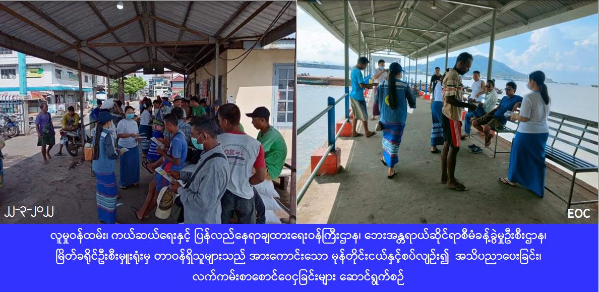 လူမှုဝန်ထမ်း၊ ကယ်ဆယ်ရေးနှင့် ပြန်လည်နေရာချထားရေးဝန်ကြီးဌာန၊ ဘေးအန္တရာယ်ဆိုင်ရာစီမံခန့်ခွဲမှုဦးစီးဌာန၊ မြိတ်ခရိုင်ဦးစီးမှူးရုံးမှ တာဝန်ရှိသူများသည် (၂၂-၃-၂၀၂၂) ရက်နေ့တွင် ပြန်ကြားရေးနှင့်ပြည်သူ့ဆက်ဆံရေးဦးစီးဌာနနှင့်ပူးပေါင်း၍ ကပ္ပလီပင်လယ်ပြင်နှင့် ယင်းနှင့်ဆက်စပ်လျက်ရှိသော ဘင်္ဂလားပင်လယ်အော်အရှေ့တောင်ပိုင်းတို့တွင် ဖြစ်ပေါ်နေသည့် အားကောင်းသော မုန်တိုင်းငယ်အရှိန်ကြောင့် သဘာဝဘေးအန္တရာယ်များအား အများပြည်သူများအနေဖြင့် ကြိုတင်သတိပြုနိုင်ရန် ကြိုတင်ပြင်ဆင်ကာကွယ်မှုများပြုလုပ်နိုင်ရန် မြိတ်မြို့နယ်အတွင်း သဘာဝဘေးလက်ကမ်းစာစောင်များကို ပြည်တော်သာလှေဆိပ်၊ ဆိပ်ငယ်ဘောတံတား၊ နောက်လယ်ဘောတံတားနှင့် အများပြည်သူပိုင်နေရာများတွင် အသိပညာပေးခြင်း၊ လက်ကမ်းစာစောင်ဝေငှခြင်းများ ဆောင်ရွက်ခဲ့ကြောင်း သိရှိရပါသည်။