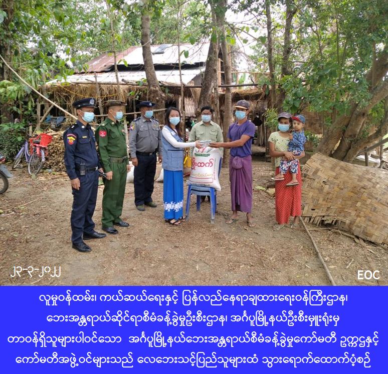 လူမှုဝန်ထမ်း၊ ကယ်ဆယ်ရေးနှင့် ပြန်လည်နေရာချထားရေးဝန်ကြီးဌာန၊ ဘေးအန္တရာယ်ဆိုင်ရာစီမံခန့်ခွဲမှုဦးစီးဌာန၊ အင်္ဂပူမြို့နယ်ဦးစီးမှူးရုံးမှ တာဝန်ရှိသူများပါဝင်သော အင်္ဂပူမြို့နယ်ဘေးအန္တရာယ်စီမံခန့်ခွဲမှုကော်မတီ ဥက္ကဌနှင့် ကော်မတီအဖွဲ့ဝင်များသည် အင်္ဂပူမြို့နယ်၊ သက္ကယ်ပြင်(သံ)ကျေးရွာအုပ်စု၊ သက္ကယ်ပြင်(သံ)ကျေးရွာ၌ (၂၂-၃-၂၀၂၂) ရက်နေ့တွင် ဖြစ်ပွားခဲ့သော လေဘေးကြောင့် တစ်စိတ်တစ်ပိုင်းပျက်စီးခဲ့သည့် အိမ်ခြေ(၁)လုံးအတွက် ကော်မတီမှ ဆန် (၁) အိတ်၊ ဘေးအန္တရာယ်ဆိုင်ရာစီမံခန့်ခွဲမှုဦးစီးဌာနမှ အိမ်ဆောက်ပစ္စည်းဖိုး(၄၀၀၀၀/-)ကျပ်၊ အိမ်ထောင်စု(၁)စုရှိ လူဦးရေ(၃)ဦးတို့အတွက် ဆန်ရိက္ခာဖိုး(၆၃၀ဝိ/-)ကျပ်၊ စုစုပေါင်းကယ်ဆယ်ရေးထောက်ပံ့ရန်ပုံငွေ (၄၆၃၀ဝိ/-) ကျပ်နှင့် Mask များကို (၂၃-၃-၂၀၂၂)ရက်နေ့၊ (၀၉:၂၀)နာရီအချိန်တွင် သွားရောက်ထောက်ပံပေးအပ်ခဲ့ကြောင်း သတင်းရရှိပါသည်။