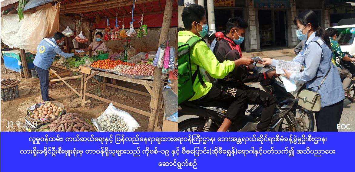 လူမှုဝန်ထမ်း၊ ကယ်ဆယ်ရေးနှင့် ပြန်လည်နေရာချထားရေးဝန်ကြီးဌာန၊ ဘေးအန္တရာယ်ဆိုင်ရာစီမံခန့်ခွဲမှုဦးစီးဌာန၊ လားရှိုးခရိုင်ဦးစီးမှူးရုံးမှ တာဝန်ရှိသူများသည် (၂၇-၃-၂၀၂၂) ရက်နေ့၊ နံနက်ပိုင်းတွင် သက်ဆိုင်ရာဌာနဆိုင်ရာများနှင့် ပူးပေါင်း၍ ရပ်ကွက်(၇)နှင့် ညနေပိုင်းတွင် ရပ်ကွက်(၁)ရဲဘော်ဟောင်းနေ ပြည်သူများအား ကိုဗစ်-၁၉ နှင့် ဗီဇပြောင်း(အိုမီခရွန်)ရောဂါနှင့်ပတ်သက်၍ လိုက်နာရမည့်အချက်များကို အသံချဲ့စက်ဖြင့် လိုက်လံဆော်သြပြီး လက်ကမ်းစာစောင်များ၊ မက်(စ်)များ ဖြန့်ဝေပေးခဲ့ကြောင်း သတင်းရရှိပါသည်။