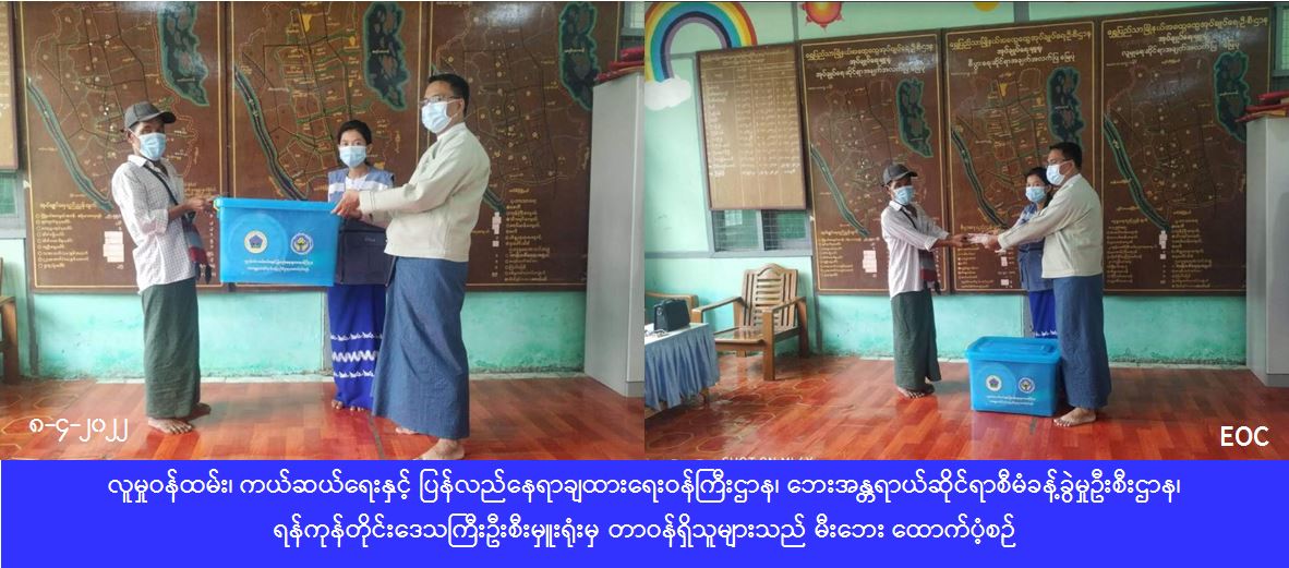 လူမှုဝန်ထမ်း၊ ကယ်ဆယ်ရေးနှင့် ပြန်လည်နေရာချထားရေးဝန်ကြီးဌာန၊ ဘေးအန္တရာယ်ဆိုင်ရာစီမံခန့်ခွဲမှုဦးစီးဌာန၊ ရန်ကုန်တိုင်းဒေသကြီးဦးစီးမှူးရုံးမှ တာဝန်ရှိသူများသည် ရန်ကုန်တိုင်းဒေသကြီး၊ မြောက်ပိုင်းခရိုင်၊ ရွှေပြည်သာမြို့နယ်၊ အမှတ်(၁၁)ရပ်ကွက်၊ အောင်စစ်သည်လမ်း၌ (၁၂-၃-၂၀၂၂)ရက်နေ့၊ (၂၁:၀၀) နာရီအချိန်တွင် ဖြစ်ပွားခဲ့သော မီးလောင်ကျွမ်းမှုကြောင့် အိမ်ခြေ (၁)လုံး လုံးဝပျက်စီးခဲ့ပြီး အိမ်ထောင်စု(၁)စုမှ လူဦးရေ(၃)ဦးတို့ မီးဘေးသင့်ခဲ့ပါသဖြင့် မီးဘေးသင့်အိမ်ခြေ(၁)လုံးအတွက် အိမ်ဆောက်ပစ္စည်းဖိုးထောက်ပံ့ငွေကျပ် (၂၀၀၀၀၀/-)ကျပ်၊လူဦးရေ (၃)ဦးအတွက် ဆန်ရိက္ခာဖိုးထောက်ပံ့ငွေကျပ် (၆၃၀၀/-)ကျပ်၊ ကယ်ဆယ်ရေးပစ္စည်း (၁၇)မျိုး (၁)အိမ်ထောင်စုစာနှင့် ကိုဗစ်-၁၉ ကြိုတင်ကာကွယ်ရန် အိမ်ထောင်စု (၁)စုအတွက် ဆပ်ပြာ (၁)တောင့်၊ လူဦးရေ(၃)ဦးအတွက် Mask (၆)ခုတို့အား ရွှေပြည်သာမြို့နယ်အထွေထွေအုပ်ချုပ်ရေးဦးစီးဌာနမှ တာဝန်ရှိသူများနှင့်အတူ (၈-၄-၂၀၂၂)ရက်နေ့၊ (၁၅:၀၀)နာရီအချိန်တွင် သွားရောက်ထောက်ပံ့ခဲ့ကြောင်း သတင်းရရှိပါသည်။