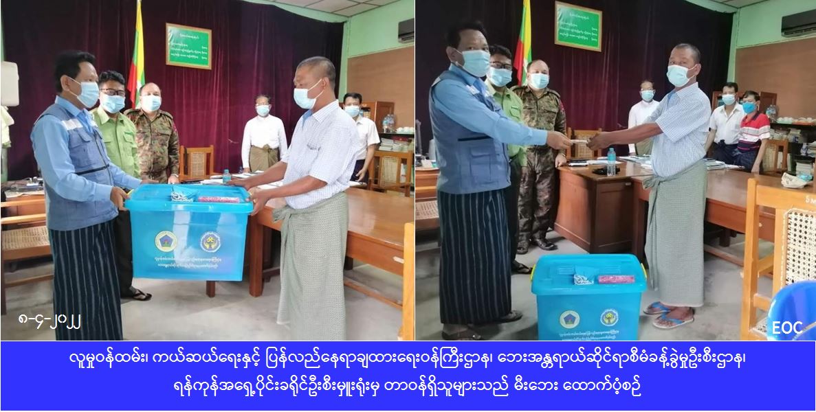လူမှုဝန်ထမ်း၊ ကယ်ဆယ်ရေးနှင့် ပြန်လည်နေရာချထားရေးဝန်ကြီးဌာန၊ ဘေးအန္တရာယ်ဆိုင်ရာစီမံခန့်ခွဲမှုဦးစီးဌာန၊ ရန်ကုန်အရှေ့ပိုင်းခရိုင်ဦးစီးမှူးရုံးမှ တာဝန်ရှိသူများသည် ရန်ကုန်တိုင်းဒေသကြီး၊ အရှေ့ပိုင်းခရိုင်၊ ဒေါပုံမြို့နယ်၊ ကြည်စုရပ်ကွက်၊ ဇေယျာသိဒ္ဓိလမ်းနှင့် ဇေယျာသီရိလမ်း၌ (၂၈-၃-၂၀၂၂)ရက်နေ့၊ (၂၁:၁၀)နာရီအချိန်တွင် ဖြစ်ပွားခဲ့သော မီးလောင်ကျွမ်းမှုကြောင့် အိမ်ခြေ(၁)လုံး လုံးဝပျက်စီးခဲ့ပြီး အိမ်ထောင်စု(၁)စုမှ လူဦးရေ (၅)ဦးတို့ မီးဘေးသင့်ခဲ့ပါသဖြင့် မီးဘေးသင့်အိမ်ခြေ(၁)လုံးအတွက် အိမ်ဆောက်ပစ္စည်းဖိုးထောက်ပံ့ငွေကျပ် (၂၀၀၀၀၀/-)ကျပ်၊ လူဦးရေ (၅)ဦးအတွက် ဆန်ရိက္ခာဖိုးထောက်ပံ့ငွေကျပ် (၁၀၅၀၀/-)ကျပ်၊ ကယ်ဆယ်ရေးပစ္စည်း (၁၇)မျိုး (၁)အိမ်ထောင်စုစာနှင့် ကိုဗစ်-၁၉ ကြိုတင်ကာကွယ်ရန် အိမ်ထောင်စု (၁)စုအတွက် ဆပ်ပြာ (၁)တောင့်၊ လူဦးရေ(၅)ဦးအတွက် Mask (၁၀)ခုတို့အား ဒေါပုံမြို့နယ်အထွေထွေအုပ်ချုပ်ရေးဦးစီးဌာနမှ တာဝန်ရှိသူများနှင့်အတူ (၈-၄-၂၀၂၂)ရက်နေ့၊ (၁၅:၃၀)နာရီအချိန်တွင် သွားရောက်ထောက်ပံ့ခဲ့ကြောင်း သတင်းရရှိပါသည်။