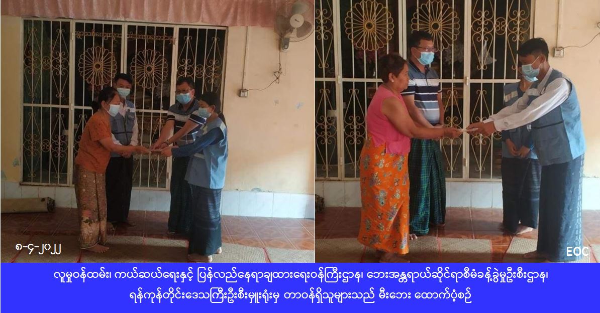 လူမှုဝန်ထမ်း၊ ကယ်ဆယ်ရေးနှင့် ပြန်လည်နေရာချထားရေးဝန်ကြီးဌာန၊ ဘေးအန္တရာယ်ဆိုင်ရာစီမံခန့်ခွဲမှုဦးစီးဌာန၊ ရန်ကုန်တိုင်းဒေသကြီးဦးစီးမှူးရုံးမှ တာဝန်ရှိသူများသည် ရန်ကုန်တိုင်းေဒသကြီး၊ မြောက်ပိုင်းခရိုင်၊ မင်္ဂလာဒုံမြို့နယ်၊ နွယ်ခွေကျေးရွာအုပ်စု၊ ရွာသစ်ကျေးရွာ၊ ငုရွှေဝါ(၂)လမ်း၌ (၂၀-၃-၂၀၂၂)ရက်နေ့၊ (၁၉:၄၀)နာရီအချိန်တွင် ဖြစ်ပွားခဲ့သော မီးလောင်ကျွမ်းမှုကြောင့် အိမ်ခြေ (၅)လုံးလုံးဝပျက်စီးခဲ့ပြီး အိမ်ထောင်စု(၈)စုမှ လူဦးရေ(၃၃)ဦးတို့ မီးဘေးသင့်ခဲ့ပါသဖြင့် မီးဘေးသင့်အိမ်ခြေ(၅)လုံး၊ အိမ်ထောင်စု(၈)စုအတွက် ကယ်ဆယ်ရေးပစ္စည်း(၁၇)မျိုး (၈)အိမ်ထောင်စုစာနှင့် ကိုဗစ်-၁၉ ကြိုတင်ကာကွယ်ရန် အိမ်ထောင်စု (၈)စုအတွက် ဆပ်ပြာ (၈)တောင့်၊ လူဦးရေ(၃၃)ဦးအတွက် Mask (၆၆)ခုတို့အား မင်္ဂလာဒုံမြို့နယ်အထွေထွေအုပ်ချုပ်ရေးဦးစီးဌာနမှ တာဝန်ရှိသူများနှင့်အတူ (၂၃-၃-၂၀၂၂)ရက်နေ့တွင် သွားရောက်ထောက်ပံ့ခဲ့ပြီးဖြစ်ရာ ယခုအခါထပ်မံ၍ ထောက်ပံ့ရန်ကျန်ရှိသော အိမ်ဆောက်ပစ္စည်းဖိုးထောက်ပံ့ငွေကျပ် (၁၀၀၀၀၀၀/-) ကျပ်နှင့် လူဦးရေ (၃၃)ဦးအတွက် ဆန်ရိက္ခာဖိုးထောက်ပံ့ငွေကျပ် (၆၉၃၀၀/-)ကျပ်တိတိတို့အား မင်္ဂလာဒုံမြို့နယ်အထွေထွေအုပ်ချုပ်ရေးဦးစီးဌာနမှ တာဝန်ရှိသူများနှင့်အတူ (၈-၄-၂၀၂၂)ရက်နေ့၊ (၁၆:၃၀)နာရီအချိန်တွင် သွားရောက်ထောက်ပံ့ခဲ့ပြီးဖြစ်ကြောင်း သတင်းရရှိပါသည်။