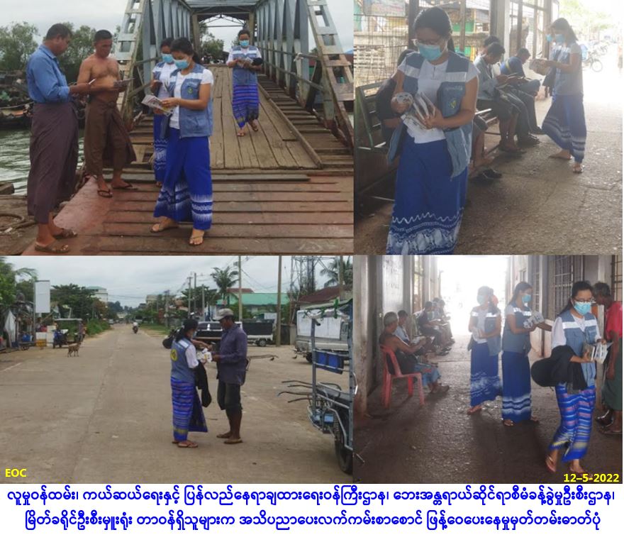 လူမှုဝန်ထမ်း၊ ကယ်ဆယ်ရေးနှင့် ပြန်လည်နေရာချထားရေးဝန်ကြီးဌာန၊ ဘေးအန္တရာယ်ဆိုင်ရာစီမံ ခန့်ခွဲမှုဦးစီးဌာန၊မြိတ်ခရိုင်ဦးစီးမှူးရုံးမှ တာဝန်ရှိသူများသည် (၁၂-၅-၂၀၂၂) ရက်နေ့တွင် မြိတ်မြို့နယ်၊ မြို့သစ်ရပ်ကွက်၊ ယောကြီးဝတံတားရှိ ခရီးသွားရေယာဉ်များနှင့် ပြည်သူများအား မိုးဦးကာလတွင် ဖြစ်ပွား သည့် သဘာဝဘေးအန္တရာယ်များနှင့်ပတ်သက်၍ ကြိုတင်သတိပြုနိုင်ရန်၊ ကြိုတင်ပြင်ဆင်ကာကွယ်မှု များပြုလုပ်နိုင်ရန်အတွက် သဘာဝဘေးအသိပညာပေး လက်ကမ်းစာစောင် ဖြန့်ဝေပေးခြင်းများ ဆောင်ရွက်ခဲ့ပါကြောင်း သတင်းရရှိပါသည်။