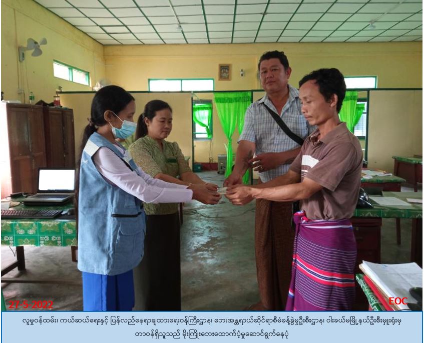 လူမှုဝန်ထမ်း၊ ကယ်ဆယ်ရေးနှင့် ပြန်လည်နေရာချထားရေးဝန်ကြီးဌာန၊ ဘေးအန္တရာယ်ဆိုင်ရာ စီမံခန့်ခွဲမှုဦးစီးဌာန၊ မြောင်းမြခရိုင်ဦးစီးမှူးရုံး၊ ဝါးခယ်မမြို့နယ်ဦးစီးမှူးရုံးမှ တာဝန်ရှိသူသည် ဝါးခယ်မမြို့နယ်၊ ကနစိုးကုန်းကျေးရွာအုပ်စု၊ ရွာမကျေးရွာတွင်(၂၅-၅-၂၀၂၂) ရက်နေ့၌ ဖြစ်ပွားခဲ့သော မိုးကြိုးဘေးကြောင့် သေဆုံးခဲ့သူ(၁)ဦးအတွက် ထောက်ပံ့ငွေ(၃၀၀၀၀၀ိ/-)အား (၂၇-၅-၂၀၂၂)ရက်နေ့၊ (၁၇◌း၀၀)နာရီအချိန်တွင် ဝါးခယ်မမြို့နယ်၊ အထွေထွေအုပ်ချုပ်ရေးမှူးဦးစီးဌာနတွင် ဘေးသင့်ပြည်သူ ၏မိသားစုဝင်ထံ လက်ဝယ်အရောက် ထောက်ပံ့ပေးအပ်ခဲ့ပါကြောင်း သတင်းရရှိပါသည်။