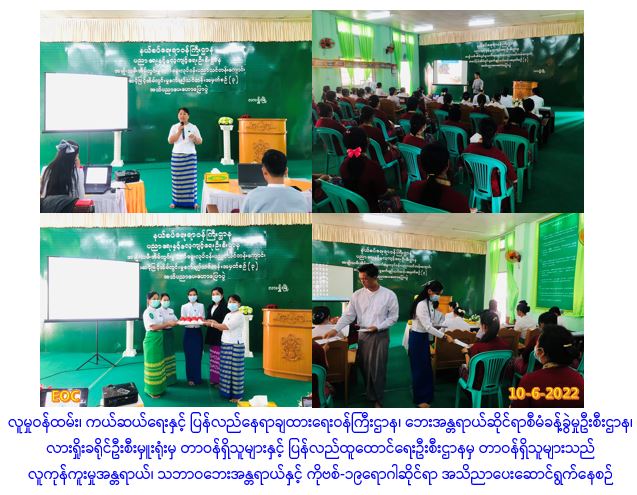 လူမှုဝန်ထမ်း၊ ကယ်ဆယ်ရေးနှင့် ပြန်လည်နေရာချထားရေးဝန်ကြီးဌာန၊ ဘေးအန္တရာယ်ဆိုင်ရာစီမံခန့်ခွဲမှုဦးစီးဌာန၊ လားရှိုးခရိုင်ဦးစီးမှူးရုံးမှ တာဝန်ရှိသူများသည် ပြန်လည်ထူထောင်ရေးဦးစီးဌာနမှ တာဝန်ရှိသူများနှင့်ပူးပေါင်း၍ (၁၀.၆.၂၀၂၂) ရက်နေ့ နံနက် (၁၀:၃၀) အချိန်မှ (၁၂:၀၀) အချိန်ထိ နယ်စပ်ရေးရာဝန်ကြီးဌာန၊ ပညာရေးနှင့်လေ့ကျင့်ရေးဦးစီးဌာန၊ အမျိုးသမီးအိမ်တွင်းမှုသက်မွေးလုပ်ငန်းပညာသင်တန်းကျောင်း(လားရှိုးမြို့)မှ သင်တန်းသူများအား သဘာဝဘေးအန္တရာယ်များနှင့်စပ်လျဉ်း၍ အသိပညာပေးခြင်း၊ ကိုဗစ်-၁၉ရောဂါကာကွယ်ရေးများ၊ မူးယစ်ဆေးနှင့် လူကုန်ကူးမှုအန္တရာယ်တို့အတွက် ဆောင်ရန်ရှောင်ရန် အချက်များအား အသိပညာပေးဟောပြောခဲ့ပြီး သဘာဝဘေးအန္တရာယ်နှင့် ကိုဗစ်-၁၉ရောဂါ ကာကွယ်ရေးလက်ကမ်းစာစောင်များဖြန့်ဝေပေးကာ လက်ဆေးဆပ်ပြာဆီများနှင့် အဝတ်Mask များအား ပေးအပ်ခဲ့ပါကြောင်း သတင်းရရှိသည်။