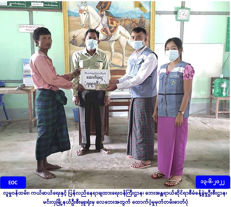 လူမှုဝန်ထမ်း၊ ကယ်ဆယ်ရေးနှင့်ပြန်လည်နေရာချထားရေးဝန်ကြီးဌာန၊ ဘေးအန္တရာယ်ဆိုင်ရာစီမံခန့်ခွဲမှုဦးစီးဌာန၊ ပဲခူးတိုင်း ဒေသကြီး၊ သာယာဝတီခရိုင်၊ မင်းလှမြို့နယ်ဦးစီးမှူးရုံးမှ တာဝန်ရှိသူများသည် ပဲခူးတိုင်းဒေသကြီး၊ သာယာဝတီခရိုင်၊ အုတ်ဖို မြို့နယ်၊ ဖလန်ပင်ကျေးရွာအုပ်စု၊ ရွာသစ်ရွာတွင် (၁၀-၆-၂၀၂၂)ရက်နေ့၌ ဖြစ်ပွားခဲ့သော လေဘေးမှ အမိုးလန်လူနေအိမ် (၂)လုံး တို့အတွက် အိမ်ဆောက်ပစ္စည်းဖိုးထောက်ပံ့ငွေ (၆၀၀၀ဝ/-)ကျပ်၊ လူဦးရေ (၉)ဦးအတွက် ဆန်ဖိုးထောက်ပံ့ငွေ (၁၈၉၀ဝ/-)ကျပ်၊ စုစုပေါင်းထောက်ပံ့ငွေ (၇၈၉၀ဝ/-)ကျပ်တို့အား (၁၃-၆-၂၀၂၂)ရက်နေ့ (၁၃:၀၀)နာရီအချိန်တွင် မြို့နယ်အထွေထွေအုပ်ချုပ်ရေး ဦးစီးဌာနမှ ဒုတိယမြို့နယ်အုပ်ချုပ်ရေးမှူးနှင့် တာဝန်ရှိသူများ၊ ကျေးရွာအုပ်ချုပ်ရေးမှူး၊ရပ်/ ကျေးစာရေးတို့နှင့်အတူ အထွေထွေ အုပ်ချုပ်ရေးဦးစီးဌာန အစည်းအဝေးခန်းမတွင် ဘေးသင့်ပြည်သူများ လက်ဝယ်အရောက်ထောက်ပံ့ပေးခဲ့ပါကြောင်း သတင်းရရှိပါသည်။