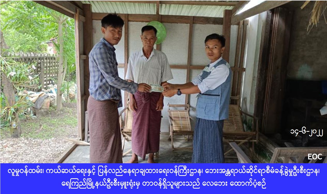 လူမှုဝန်ထမ်း၊ ကယ်ဆယ်ရေးနှင့် ပြန်လည်နေရာချထားရေးဝန်ကြီးဌာန၊ ဘေးအန္တရာယ်ဆိုင်ရာစီမံခန့်ခွဲမှုဦးစီးဌာန၊ ရေကြည်မြို့နယ်ဦးစီးမှူးရုံးမှ တာဝန်ရှိသူများသည် ရေကြည်မြို့နယ်၊ ငါးသိုင်းချောင်းမြို့၊ သက္ကယ်ပြင်ကျေးရွာအုပ်စု၊ ရွှေလောင်းကျင်းကျေးရွာတွင်(၁၁-၆-၂၀၂၂) ရက်နေ့တွင် ဖြစ်ပွားခဲ့သော လေဘေးကြောင့် အမိုးလန်ပျက်စီးနေအိမ်(၁)လုံးအတွက် အိမ်ဆောက်ပစ္စည်းဖိုး (၁၅၀၀ဝိ/-)၊ စုစုပေါင်းဘေးသင့်လူဦးရေ(၂)ဦးအတွက် ဆန်ရိက္ခာ(၇)ရက်စာရန်ပုံငွေ (၄၂၀ဝိ/-)၊ စုစုပေါင်းရန်ပုံငွေ(၁၉၂၀ဝိ/-) တိတိအား (၁၄-၆-၂၀၂၂)ရက်နေ့ (၁၃:၀၀)နာရီအချိန်တွင် တာဝန်ရှိသူများ၏ရှေ့မှောက်၌ ဘေးသင့်ပြည်သူများ၏လက်ဝယ်သို့ ထောက်ပံ့ပေးအပ်ခဲ့ကြောင်း သတင်းရရှိပါသည်။