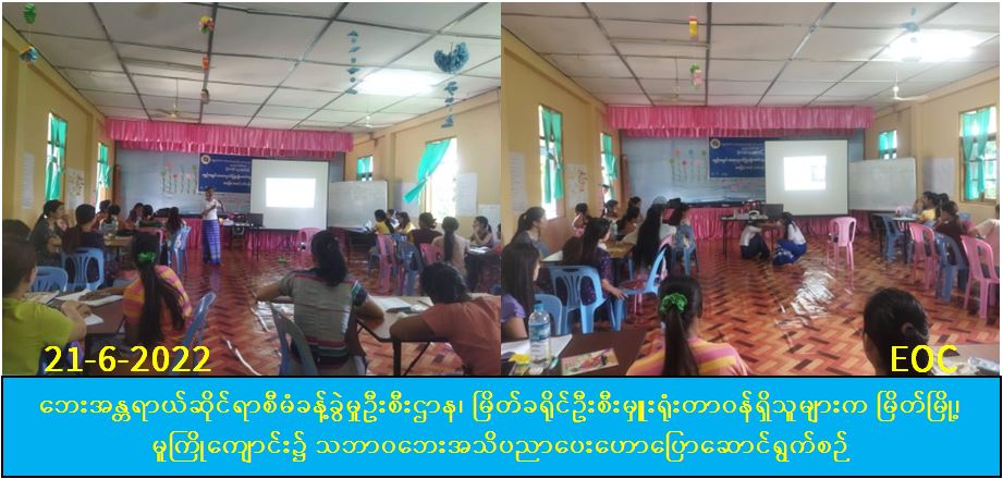 (၂၀.၆.၂၀၂၂)ရက်နေ့တွင် လူမှု၀န်ထမ်း၊ ကယ်ဆယ်ရေးနှင့်ပြန်လည်နေရာချထားရေး၀န်ကြီးဌာန၊ ဘေးအန္တရာယ်ဆိုင်ရာစီမံခန့်ခွဲမှုဦးစီးဌာန၊ မြိတ်ခရိုင်ဦးစီးမှူးရုံးမှ တာဝန်ရှိသူများသည် မြိတ်မြို့၊ မူလတန်းကြိုကျောင်းတွင် ဖွင့်လှစ်သည့် ရှေးဦးအရွယ်ကလေးသူငယ်ပြုစုပျိုးထောင်ရေးနှင့်ဖွံ့ဖြိုးရေးဆိုင်ရာအခြေခံသင်တန်း၌ သဘာဝဘေးနှင့်ပတ်သက်၍ အသိပညာရရှိစေရန်၊ ကြိုတင်ပြင်ဆင်တတ်စေရန်နှင့် အရေးပေါ်တုံ့ပြန်ဆောင်ရွက်တတ်စေရန် ရည်ရွယ်ပြီး အသိပညာပေးဟောပြောခြင်း၊ လက်ကမ်းစာစောင်များ ဖြန့်ဝေခြင်းနှင့် သရုပ်ပြခြင်းများအား ဆောင်ရွက်ခဲ့ကြောင်း သတင်းရရှိပါသည်။