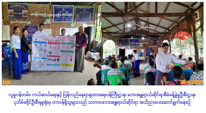 လူမှု၀န်ထမ်း၊ ကယ်ဆယ်ရေးနှင့်ပြန်လည်နေရာချထားရေး၀န်ကြီးဌာန၊ ဘေးအန္တရာယ်ဆိုင်ရာစီမံခန့်ခွဲမှုဦးစီးဌာန၊ ပုသိမ်ခရိုင်ဦးစီးမှူးရုံးမှ တာ၀န်ရှိသူများသည် ဧရာ၀တီတိုင်းဒေသကြီး လူမှု၀န်ထမ်းဦးစီးမှူးရုံးနှင့် ပူးပေါင်း၍ (၂၀-၆-၂၀၂၂)ရက်နေ့တွင် ပုသိမ်ခရိုင်၊ ပုသိမ်မြို့နယ်၊ ဇင်ပြွန်ကုန်းကျေးရွာအုပ်စု၊ ရွာသစ်ကုန်းကျေးရွာ၌ ကျေးရွာနေပြည်သူ(၅၀)ဦးခန့်အား သဘာ၀ဘေးအန္တရာယ်ဆိုင်ရာအသိပညာများနှင့် သဘာဝဘေး မဖြစ်မီ၊ ဖြစ်ဆဲ၊ ဖြစ်ပြီးကာလများ၌ ဆောင်ရန်/ရှောင်ရန်များအား ဆွေးနွေးဟောပြောခဲ့ပြီး လက်ကမ်းစာစောင်များနှင့် အသိပညာပေးဗီနိုင်းများပေးအပ်ခဲ့ပါကြောင်း သတင်းရရှိပါသည်။