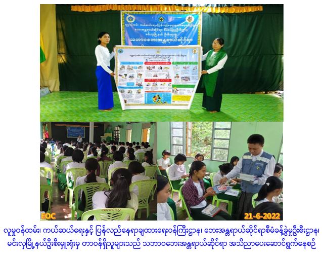 လူမှုဝန်ထမ်း၊ ကယ်ဆယ်ရေးနှင့် ပြန်လည်နေရာချထားရေဝန်ကြီးဌာန၊ ဘေးအန္တရာယ်ဆိုင်ရာစီမံခန့်ခွဲမှုဦးစီးဌာန၊ ပဲခူးတိုင်းဒေသကြီး၊ သာယာဝတီခရိုင်၊ မင်းလှမြို့နယ်ဦးစီးမှူးရုံးမှ တာဝန်ရှိသူများသည် မင်းလှမြို့နယ်အမှတ်(၇)ရပ်ကွက်၊ ဗိုလ်ရုံတန်းလမ်းရှိ အခြေခံပညာအထက်တန်းကျောင်းတွင် (၂၁-၆-၂၀၂၂)ရက်နေ့ (၀၉း၀၀)နာရီအချိန်မှ (၁၀း၃၀)နာရီ အချိန်ထိ ဆရာ/ ဆရာမများနှင့် ကျောင်းသား/ ကျောင်းသူအင်အားစုစုပေါင်း(၁၅၀)ဦးခန့်အား သဘာဝဘေးနှင့်ပတ်သက်၍ အသိပညာပေးဆွေးနွေးဟောပြောပြီး ဗလာစာအုပ်များ၊ ဘောပင်များ၊ ရေဘေးအသိပညာပေးပိုစတာ၊ လက်ကမ်းစာစောင်များ၊ ငလျင်ဘေးပိုစတာများ ဝေငှခဲ့ပါကြောင်းနှင့် အဆိုပါအခမ်းအနားသို့ မြို့နယ်ဌာနဆိုင်ရာများမှ တာဝန်ရှိသူများတက်ရောက်ခဲ့ပါကြောင်းသတင်းရရှိပါသည်။